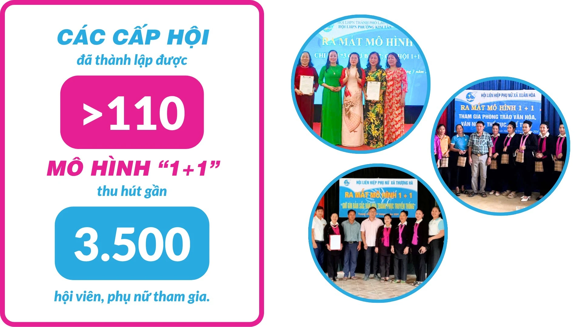 Riêng tại huyện Bảo Thắng, trong năm 2024, các cấp hội đã lựa chọn và ra mắt 13 mô hình “1+1” với 90 thành viên tham gia. Nội dung hoạt động của mô hình được lựa chọn phù hợp với thực tế của địa phương và nhu cầu của phụ nữ. Các mô hình cho thấy sự đổi mới trong hình thức sinh hoạt, chuyển đổi cách tiếp cận, đa dạng hóa các hoạt động để đáp ứng nhu cầu, nguyện vọng của chị em. Nhờ đó, năm 2024, toàn huyện kết nạp được gần 600 hội viên, tỷ lệ thu hút hội viên đạt 62%.