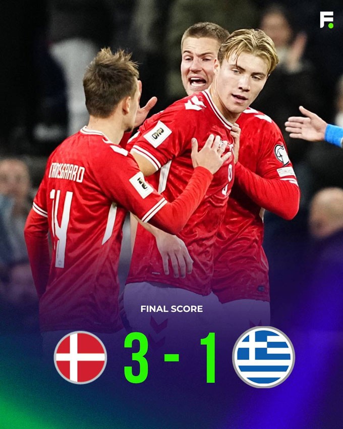 Một đội bóng khác cũng giữ được ngôi đầu là Đan Mạch. "Những chú lính chì" đánh bại Hy Lạp với tỷ số 3-1 trên sân nhà. Tiền đạo Rasmus Hojlund tiếp tục phong độ cao khi ghi bàn mở tỷ số ngay phút thứ 21.