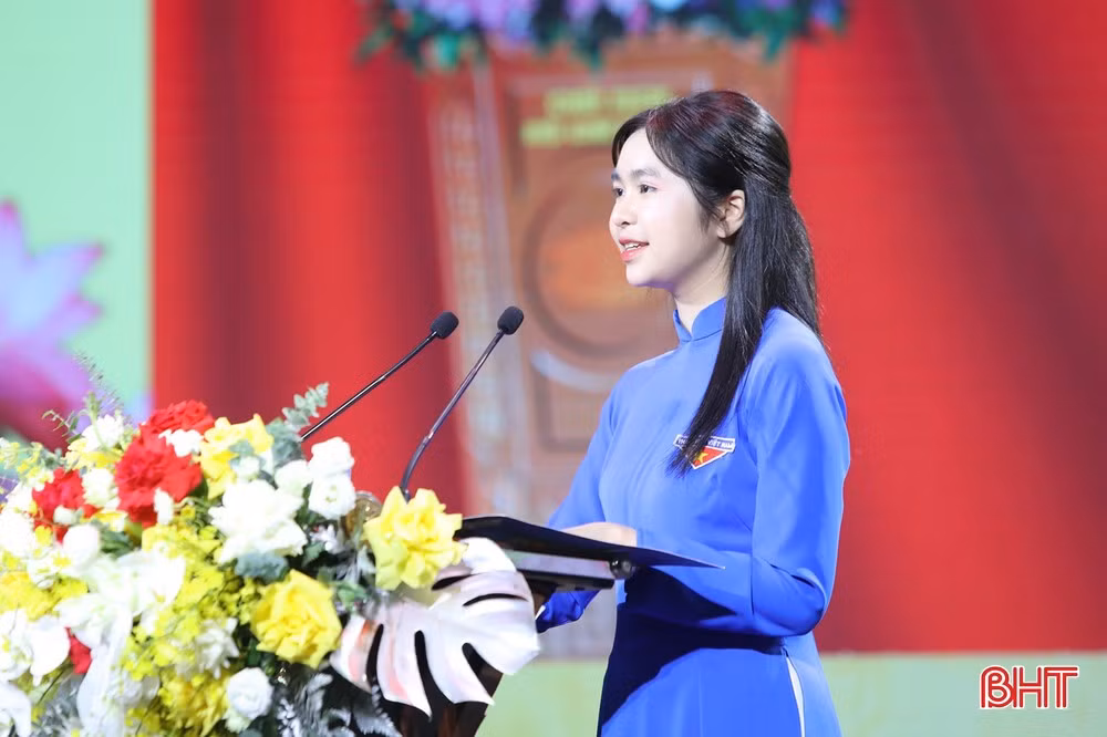 Em Hồ Phương Linh - Chi đoàn lớp 10 Anh1, Trường THPT Chuyên Hà Tĩnh đại diện thế hệ trẻ tỉnh nhà phát biểu tại buổi lễ.
