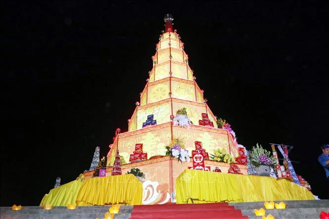 Tòa tháp 9 tầng tượng trưng cho trục nối, giao thoa trời đất, âm dương với hoa văn đặc trưng của Đạo - Phật - Nho đan xen.