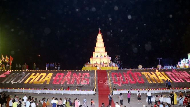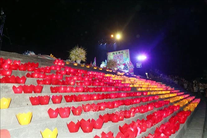 Hàng nghìn hoa đăng được thắp sáng trên đê sông Lục Đầu tạo thành hình chữ “Lễ hội hoa đăng - Quốc thái dân an”.