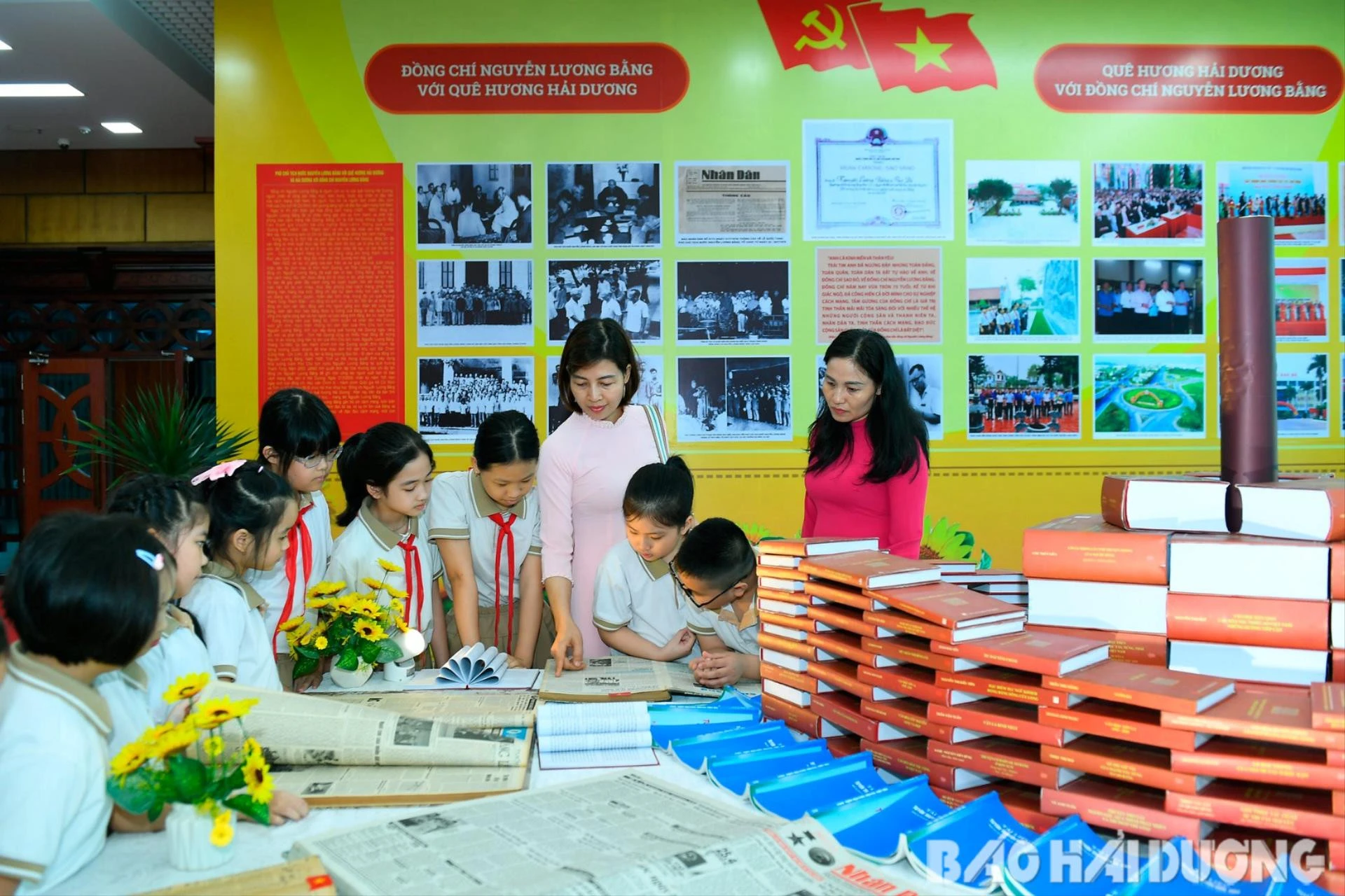 Giáo viên, học sinh Trường Tiểu học Nguyễn Lương Bằng tìm hiểu cuộc đời, sự nghiệp của đồng chí Nguyễn Lương Bằng tại khu trưng bày ở khu vực bên ngoài lễ kỷ niệm.