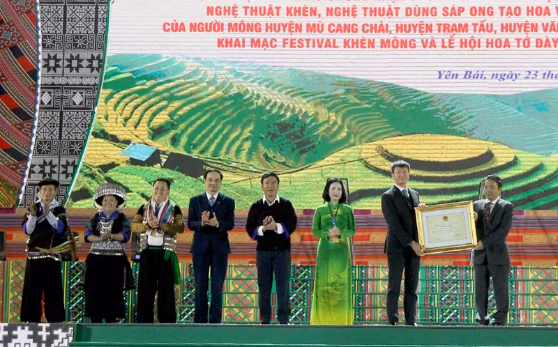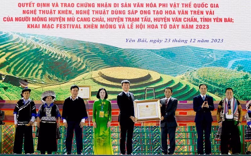 Tại buổi lễ, Bộ Văn hóa, Thể thao và Du lịch đã công bố và trao các chứng nhận đưa Nghệ thuật khèn của người Mông và Nghệ thuật dùng sáp ong tạo hoa văn trên vải của người Mông huyện Mù Cang Chải, Trạm Tấu, Văn Chấn vào danh mục Di sản văn hóa phi vật thể Quốc gia.