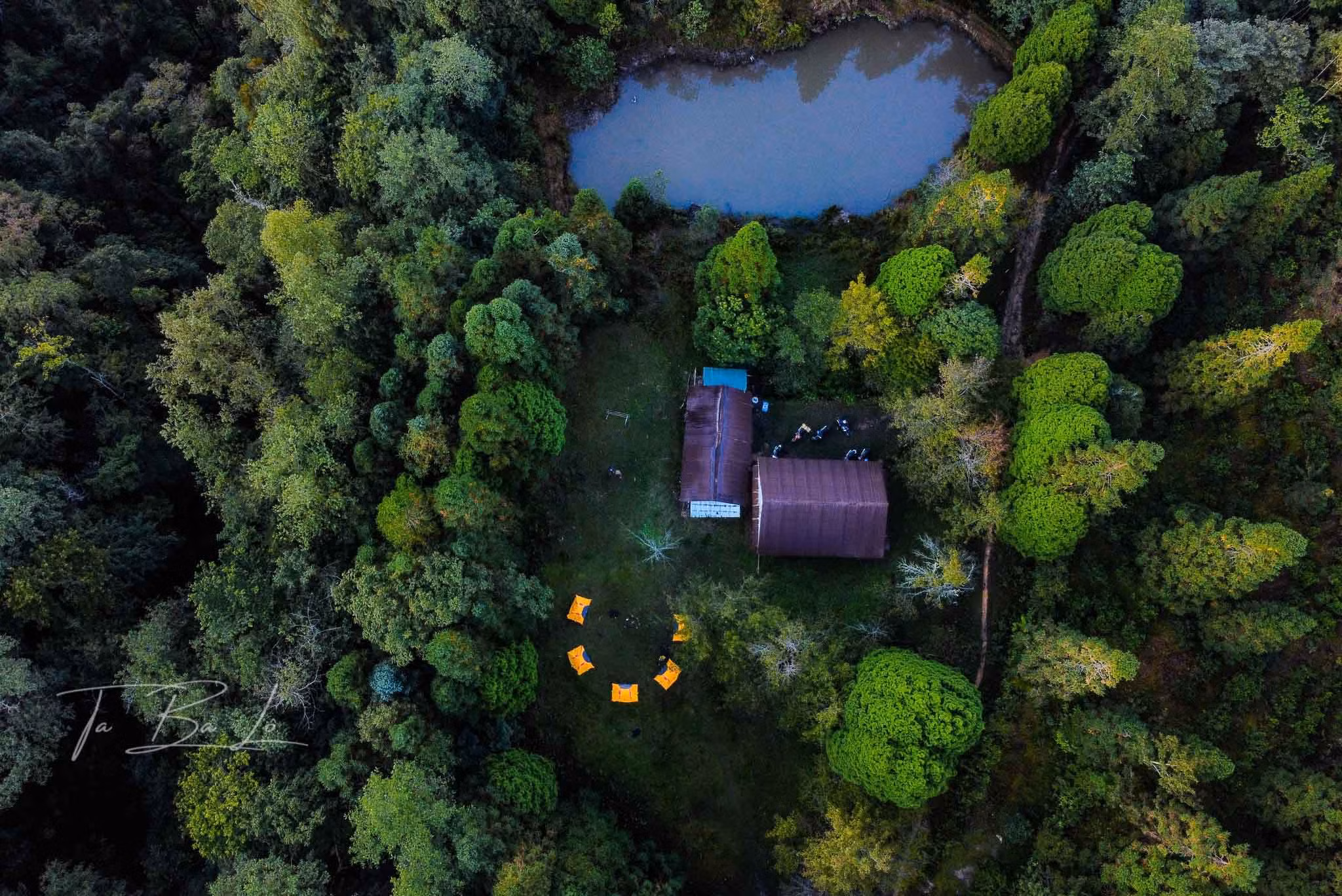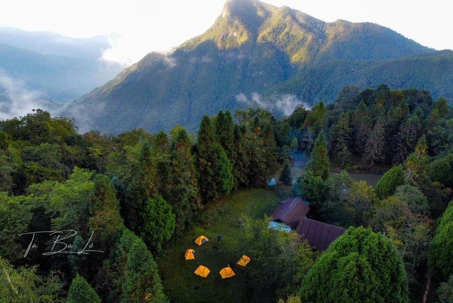 Hiking khoảng 6km, khách trekking sẽ dùng bữa trưa giữa khung cảnh rừng vầu, nghỉ ngơi và di chuyển khoảng tiếp khoảng hơn 6km nữa là sẽ đến hai lán gỗ nhỏ xinh nằm giữa một thung lũng trồng rất nhiều bạch đàn, sa mộc, lê, đào… Ngay cạnh lán gỗ có các bãi cỏ rất đẹp phù hợp để cắm trại ngoài trời. Dựng lều và chuẩn bị bữa tối xong, du khách có thể lên đỉnh 1.900m cách khu cắm trại không xa để ngắm hoàng hôn với những biển mây bồng bềnh.