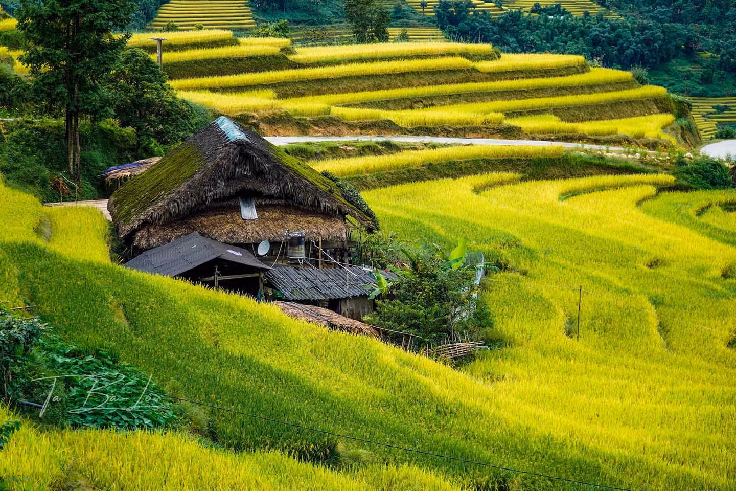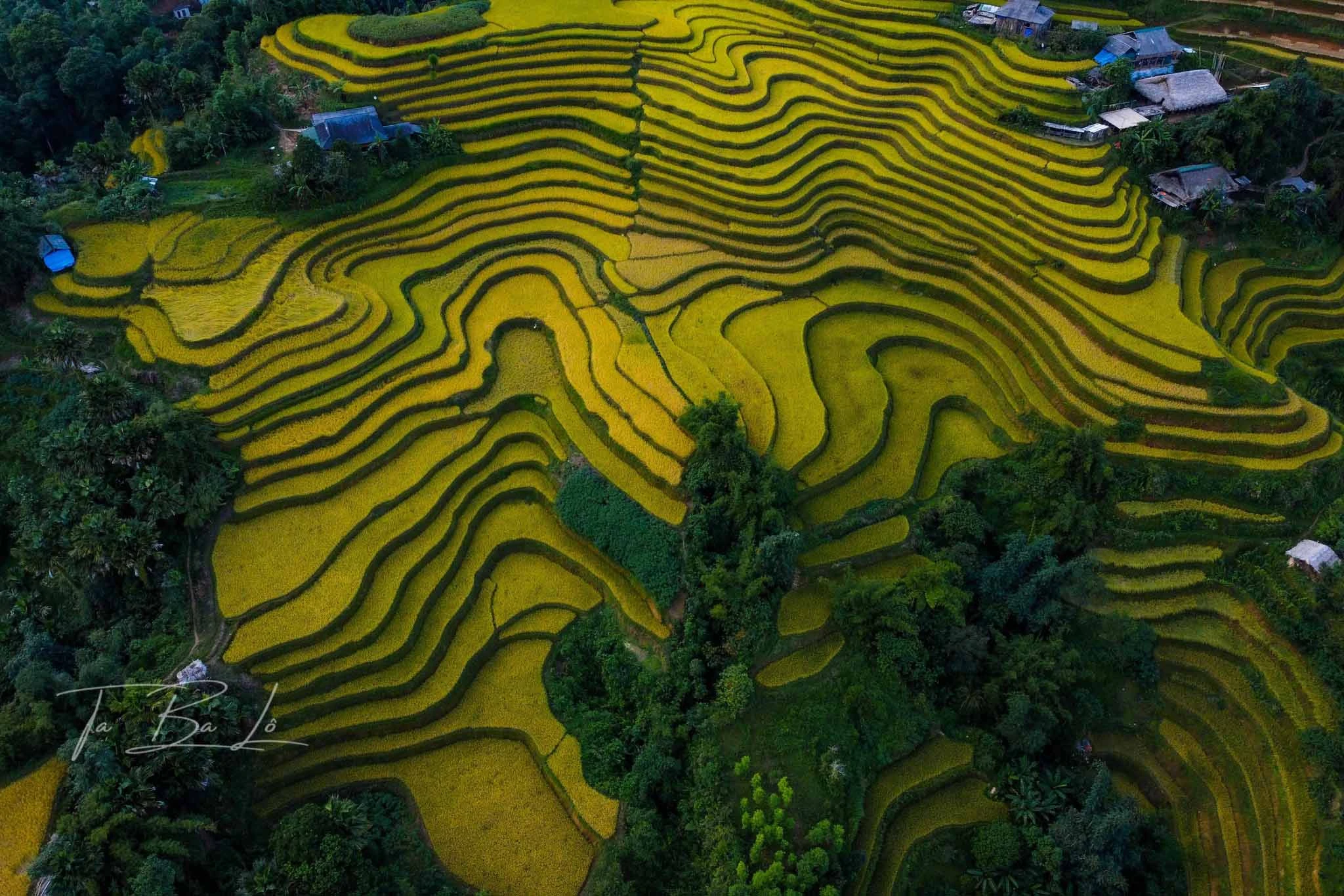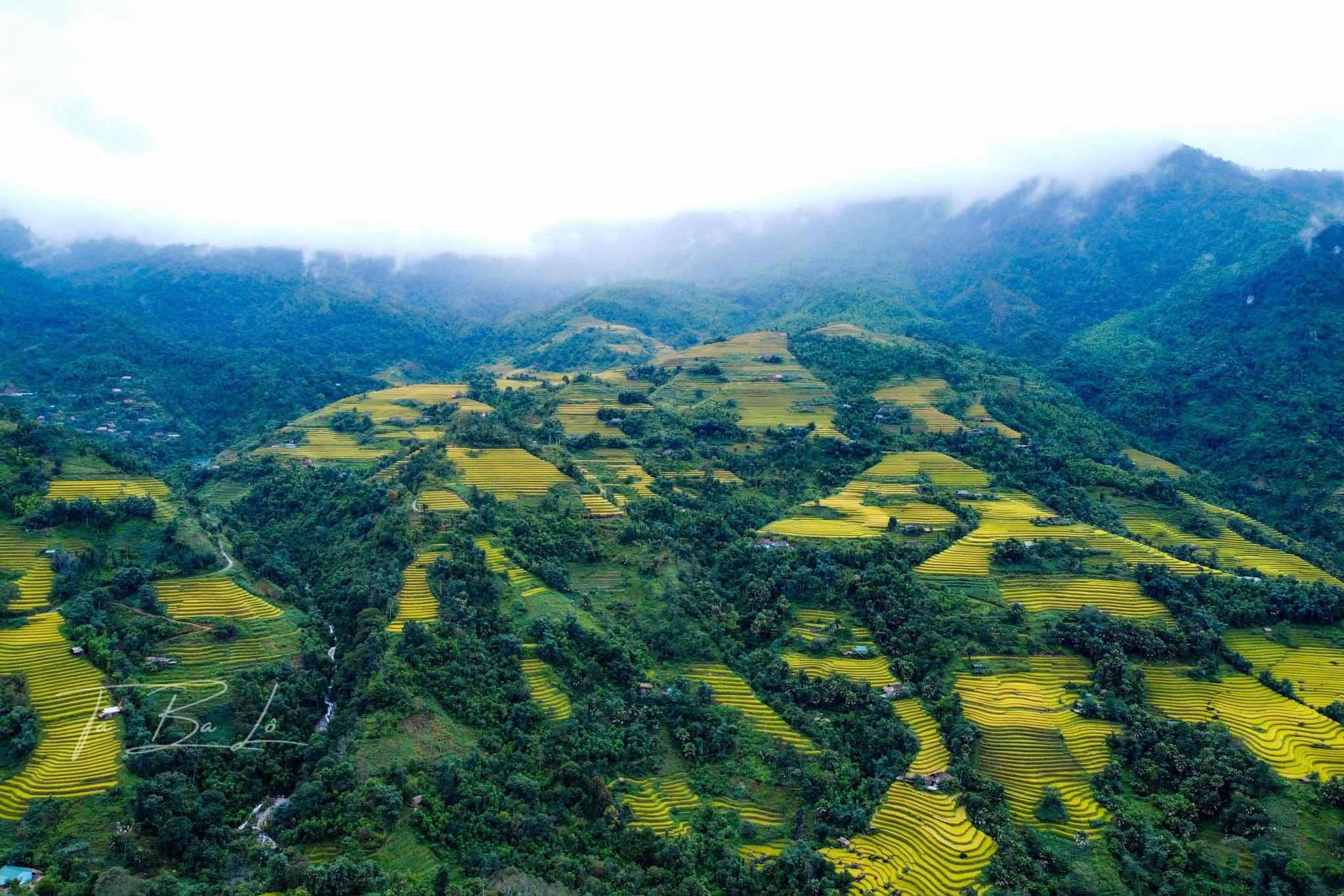 Những cánh đồng lúa chín vàng ươm là điểm nhấn thú vị trên cung đường chinh phục Tây Côn Lĩnh vào mùa Thu.