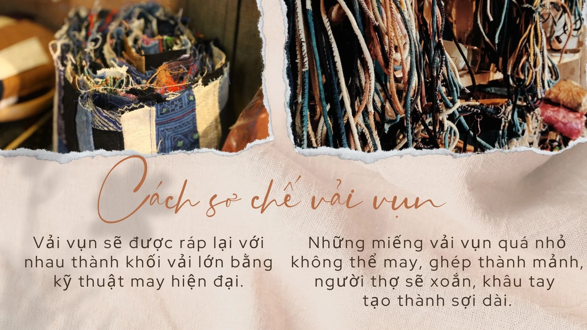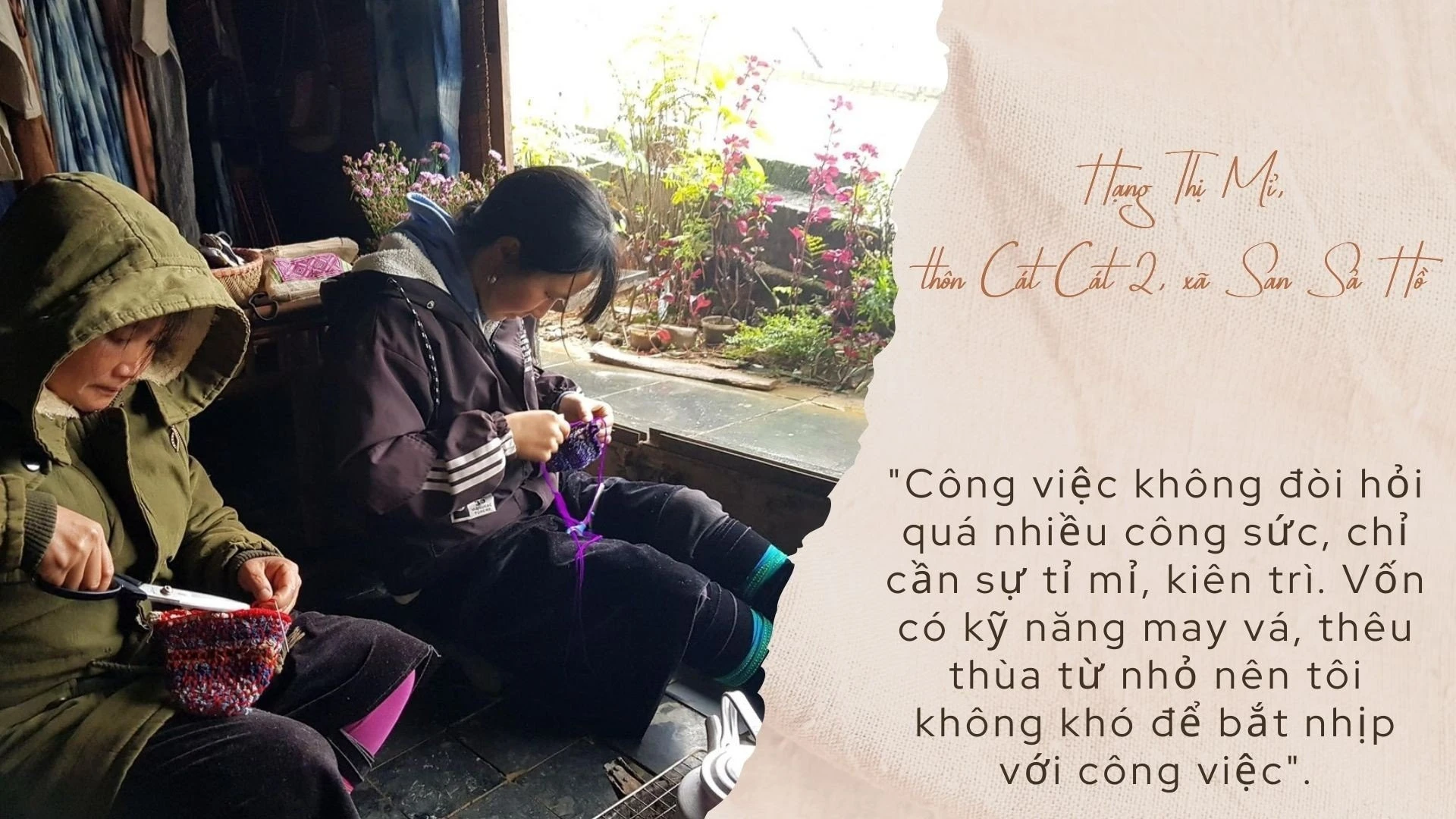 Tỉ mẩn từng đường kim, mũi chỉ, chị Hạng Thị Mỉ, thôn Cát Cát 2, xã San Sả Hồ (thị xã Sa Pa) đã khéo “biến hóa” những miếng vải tái chế thành những sản phẩm bắt mắt. Chị Mỉ cho biết: Tôi có kinh nghiệm 5 năm làm tại Linh Handicraft. Hằng ngày, tôi may sản phẩm theo yêu cầu từ vải tái chế, với tiền công từ 5 triệu đồng đến 7 triệu đồng mỗi tháng. Công việc không đòi hỏi quá nhiều công sức, chỉ cần sự tỉ mỉ, kiên trì. Vốn có kỹ năng may vá, thêu thùa từ nhỏ nên tôi không khó để bắt nhịp với công việc.