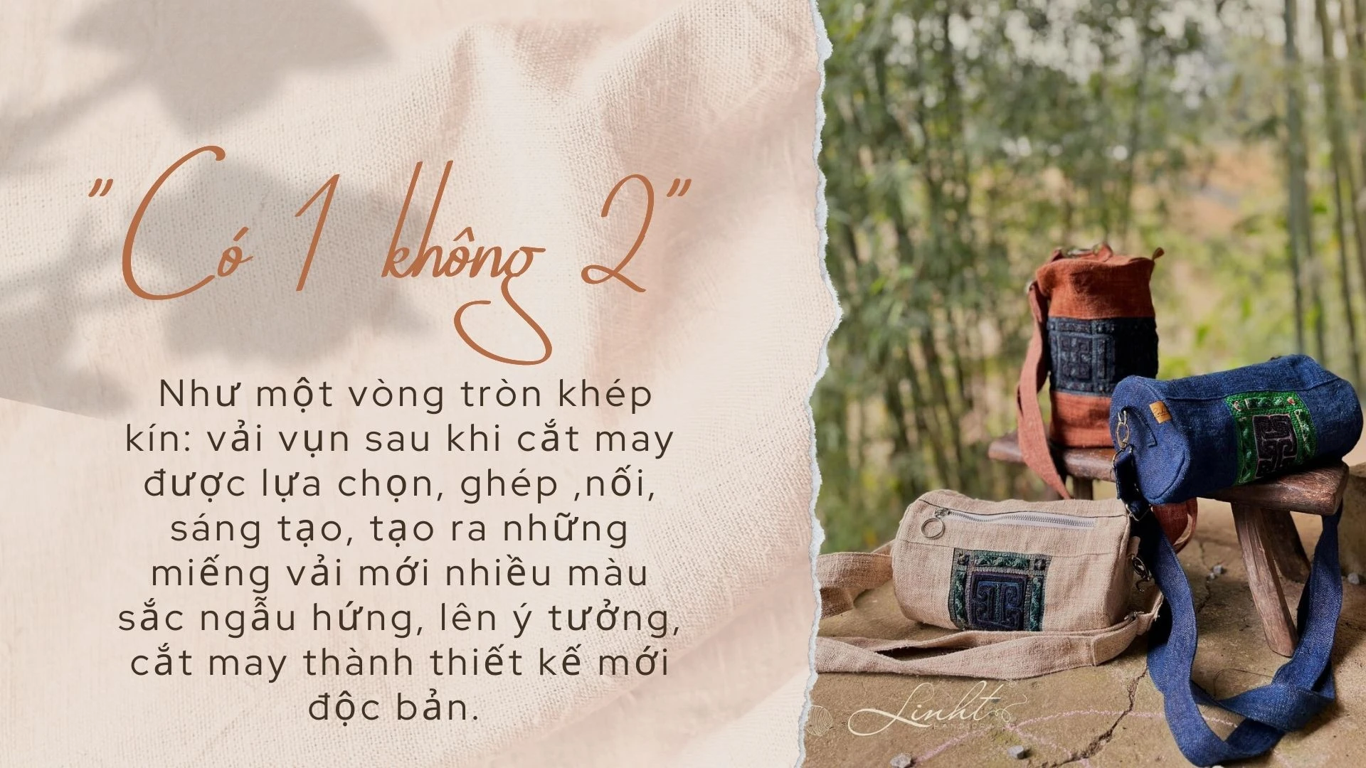 Trong một lần tình cờ dọn dẹp tiệm đồ, nhìn những đống vải vụn vương vãi dưới sàn nhà với nhiều màu sắc khác nhau, Linh nảy sinh ý tưởng “tái chế” chúng để tạo nên những sản phẩm “có một không hai”. Linh đã gom toàn bộ số vải vụn, thuê người dân trong thôn may nối lại thành những mảnh vải lớn.