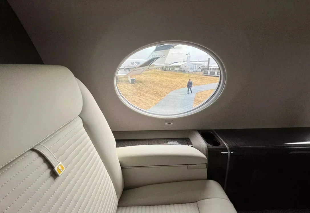 Dọc theo thân máy bay là 16 cửa sổ khổng lồ đặc trưng của Gulfstream, là cửa sổ lớn nhất trong ngành và mang đến cho hành khách tầm nhìn toàn cảnh ngoạn mục, đi kèm với rèm để hành khách có thể nghỉ ngơi.