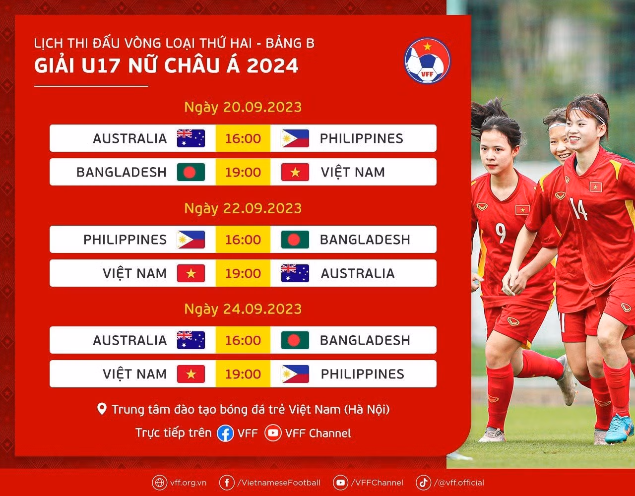 Tại vòng loại 2 giải bóng đá nữ vô địch U17 châu Á 2024, tuyển U17 nữ Việt Nam nằm ở bảng C cùng với Australia, Philippines và Bangladesh. Các trận đấu diễn ra từ 20/9 đến 24/9 tại Trung tâm đào tạo bóng đá trẻ Việt Nam (Hà Nội).