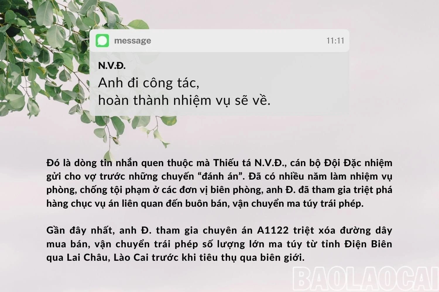 “Anh đi công tác, hoàn thành nhiệm vụ sẽ về”, đó là dòng tin nhắn quen thuộc mà Thiếu tá N.V.Đ., cán bộ Đội Đặc nhiệm gửi cho vợ trước những chuyến “đánh án”. Đã có nhiều năm làm nhiệm vụ phòng, chống tội phạm ở các đơn vị biên phòng, anh Đ. đã tham gia triệt phá hàng chục vụ án liên quan đến buôn bán, vận chuyển ma túy trái phép. Gần đây nhất, anh Đ. tham gia chuyên án A1122 triệt xóa đường dây mua bán, vận chuyển trái phép số lượng lớn ma túy từ tỉnh Điện Biên qua Lai Châu, Lào Cai trước khi tiêu thụ qua biên giới.