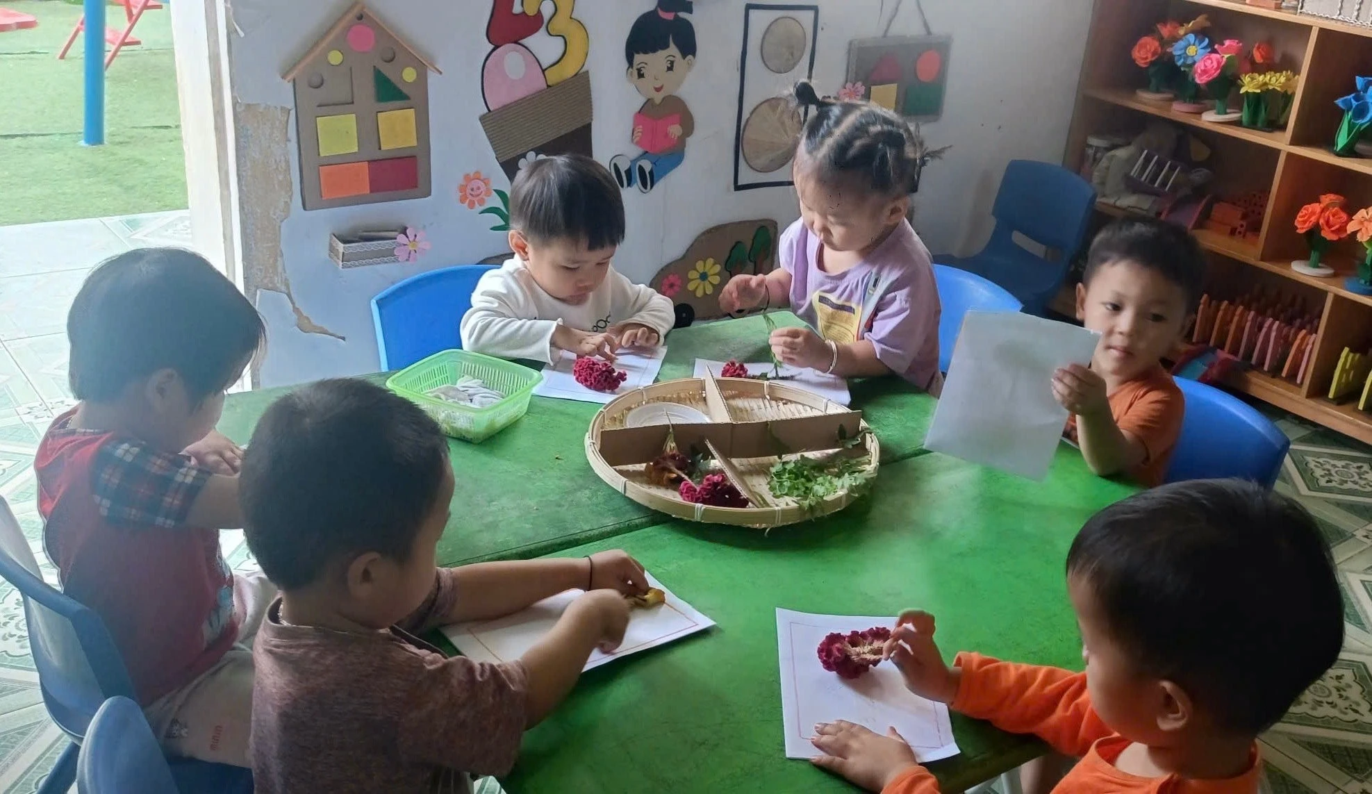 Nguyên liệu làm thiệp được cô và trò điểm trường tận dụng từ hoa, lá hay cả hạt ngô. Mỗi bé được phát một tờ giấy trắng, tự do trang trí dưới sự hướng dẫn, trợ giúp của cô giáo. Không chỉ trang trí, các cô còn hỗ trợ các bé viết một vài lời chúc đơn giản mà ý nghĩa cho ngày đặc biệt này.