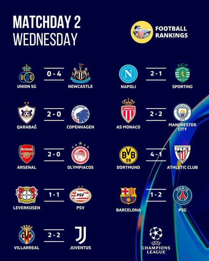 Ở các trận đấu sớm, Newcastle có chiến thắng 4-0 trước Royale Union SG trong khi Qarabag cũng đánh bại Copenhagen với tỷ số 2-0.