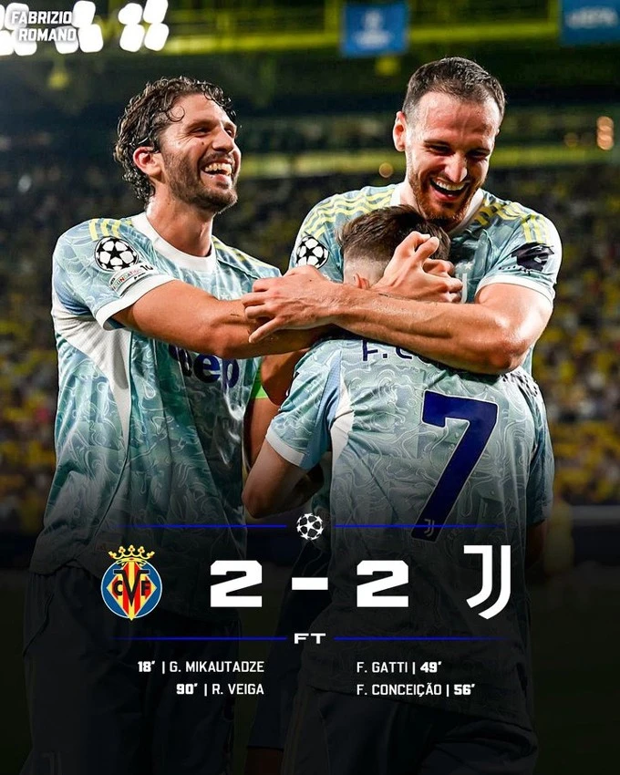 Một đội bóng của Serie A khác là Juventus lại chỉ có được trận hoà 2-2 với Villarreal. Mikautadze mở tỷ số cho Tàu ngầm vàng ở phút 18 nhưng Gatti và Conceicao đã liên tiếp ghi 2 bàn cho Juventus ở các phút 49 và 56. Dẫu vậy tới phút 90, Renato Veiga đã ghi bàn ấn định tỷ số 2-2.