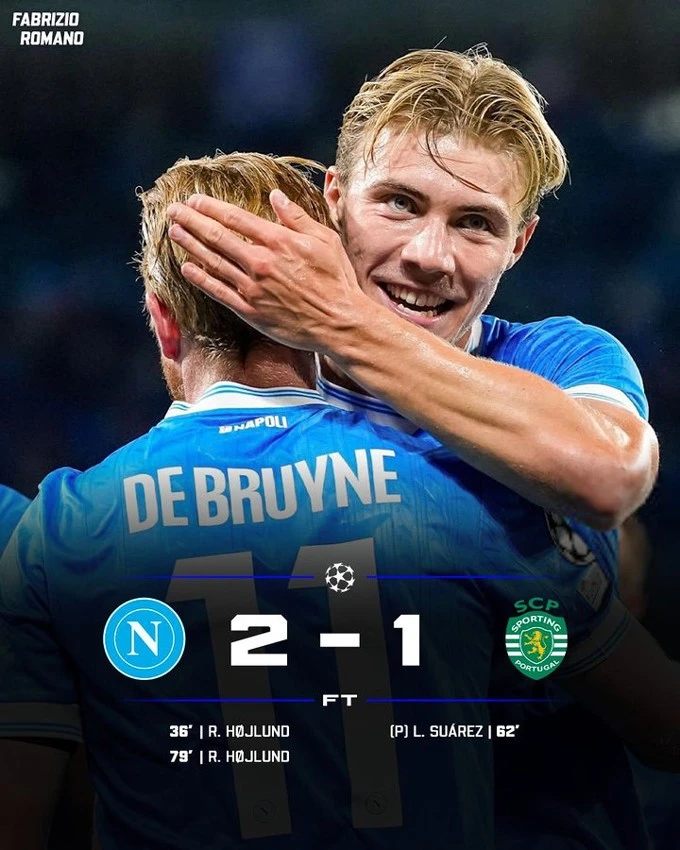 Với lợi thế sân nhà, Napoli sớm dồn ép Sporting Lisbon. Tới phút 36, De Bruyne kiến tạo thuận lợi để Hojlund ghi bàn mở tỷ số. Và tới phút 79, cặp đôi này lại cùng nhau tạo nên bàn thắng thứ 2 của Napoli. Xen giữa là bàn thắng trên chấm phạt đền của Luis Suarez cho Sporting ở phút 62.