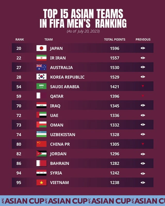 Top 15 châu Á theo BXH tháng 7/2023 của FIFA.
