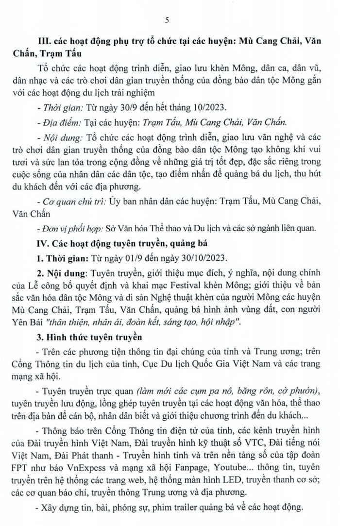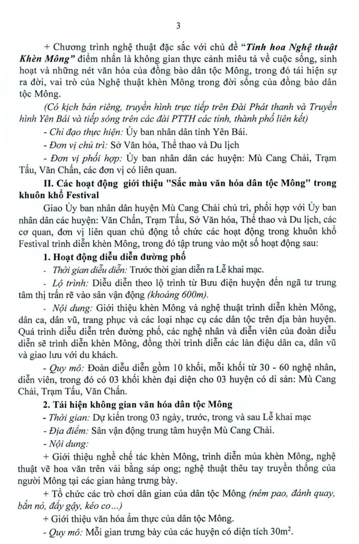 Theo đó, các hoạt động, sự kiện đáng chú ý từ nay đến cuối năm là: Lễ khai mạc Festival và công bố Quyết định Nghệ thuật Khèn Mông; hoạt động giới thiệu "Sắc màu văn hóa dân tộc Mông" trong khuôn khổ Festival và các hoạt động phụ trợ tổ chức tại các huyện: Mù Cang Chải, Văn Chấn, Trạm Tấu; các hoạt động tuyên truyền, quảng bá.