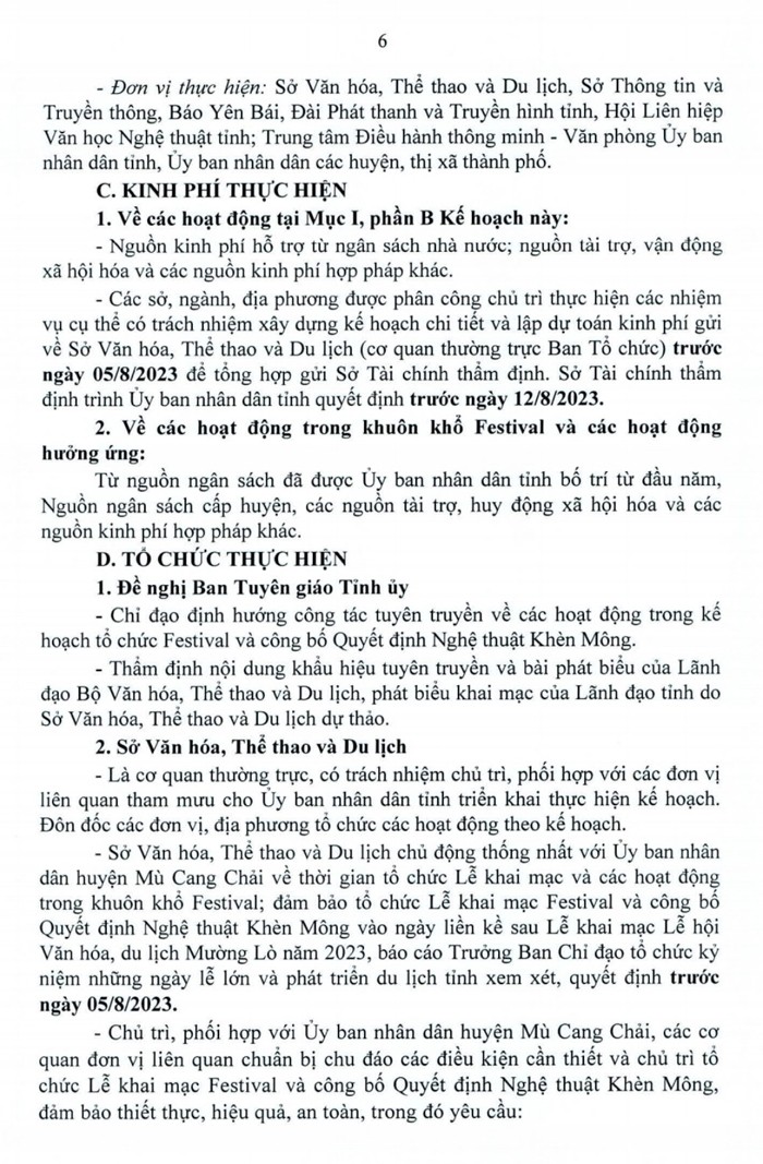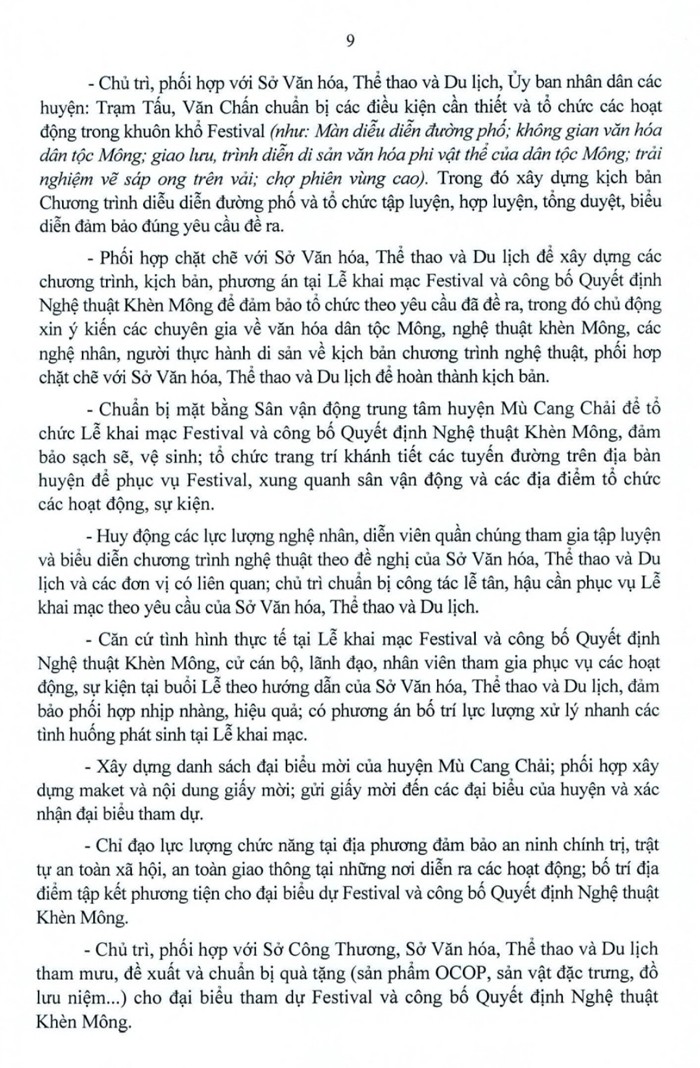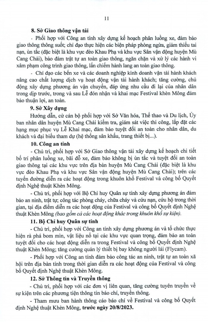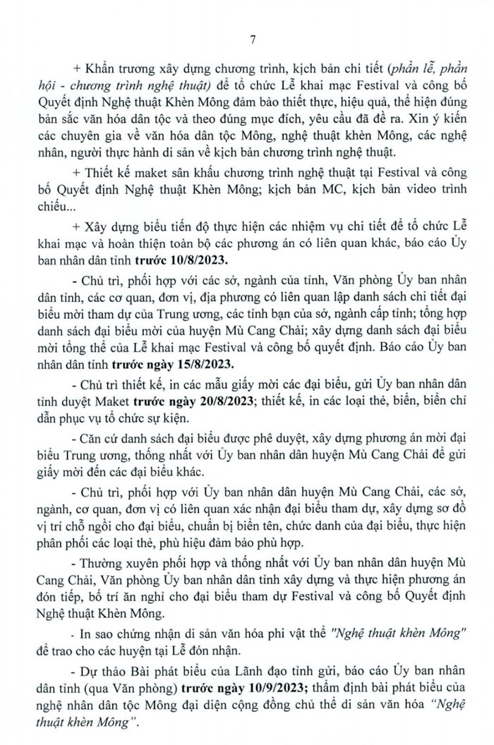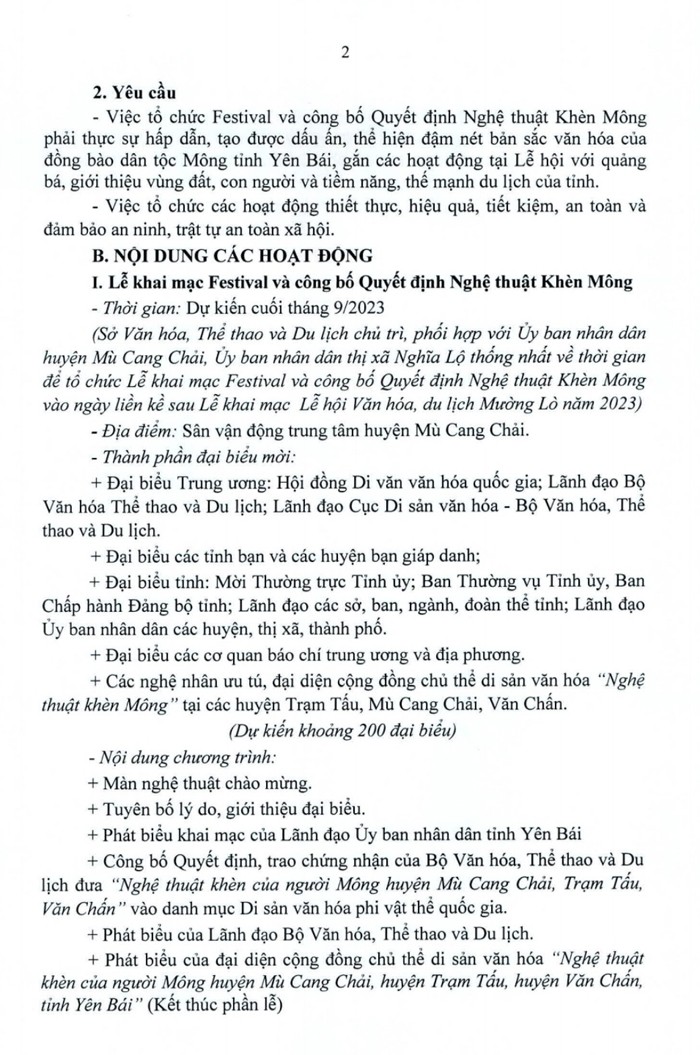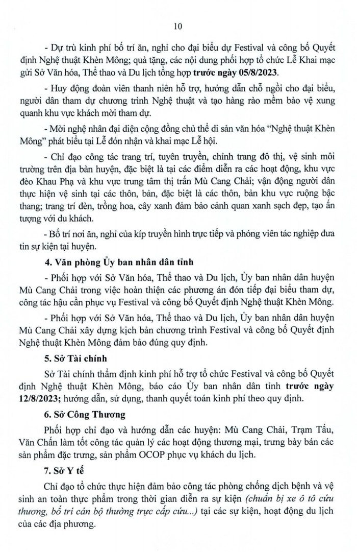 Cụ thể, Lễ khai mạc Festival và công bố Quyết định Nghệ thuật Khèn Mông vào danh mục Di sản văn hóa phi vật thể quốc gia, UBND tinh yêu cầu Sở Văn hóa -Thể thao và Du lịch chủ trì, phối hợp với UBND Mù Cang Chải và UBND thị xã Nghĩa Lộ thống nhất về thời gian để tổ chức Lễ khai mạc Festival và công bố Quyết định vào ngày liền kề sau Lễ khai mạc Lễ hội Văn hóa, du lịch Mường Lò năm 2023.