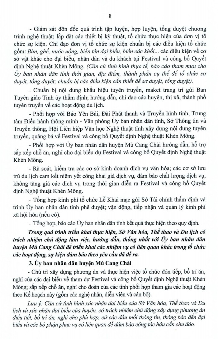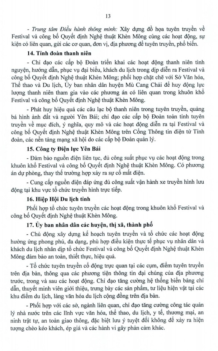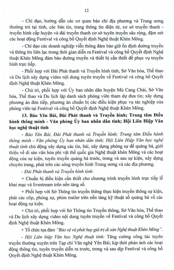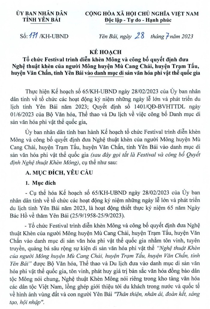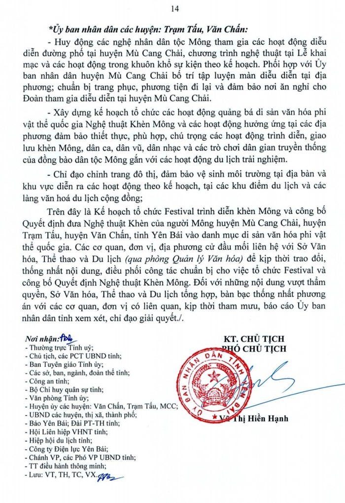 Phó Chủ tịch UBND tỉnh Vũ Thị Hiền Hạnh vừa ký ban hành Kế hoạch số 171/ KH-UBND gửi Ban Tuyên giáo Tỉnh ủy; Văn phòng Ủy ban nhân dân tỉnh; các sở: Văn hóa- Thể thao và Du lịch, Tài chính, Y tế, Công Thương, Giao thông vận tải, Xây dựng; Công an tỉnh; Bộ Chỉ huy Quân sự tỉnh; Thông tin và Truyền thông; Báo Yên Bái, Đài Phát thanh và Truyền hình; Trung tâm Điều hành thông minh - Văn phòng Ủy ban nhân dân tỉnh; Hội Liên Hiệp Văn học nghệ thuật tỉnh; Tỉnh đoàn thanh niên; Công ty Điện lực Yên Bái; Hiệp Hội Du lịch tỉnh; UBND huyện Mù Cang Chải và UBND các huyện, thị xã, thành phố về tổ chức Festival trình diễn khèn Mông và công bố quyết định đưa Nghệ thuật khèn của người Mông huyện Mù Cang Chải, huyện Trạm Tấu, huyện Văn Chấn, tỉnh Yên Bái vào danh mục Di sản văn hóa phi vật thể quốc gia.