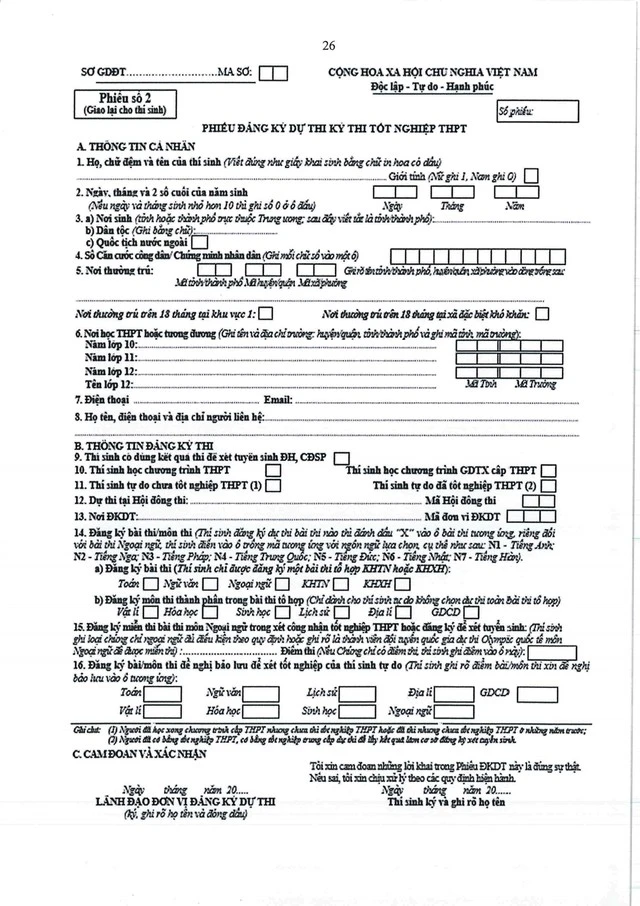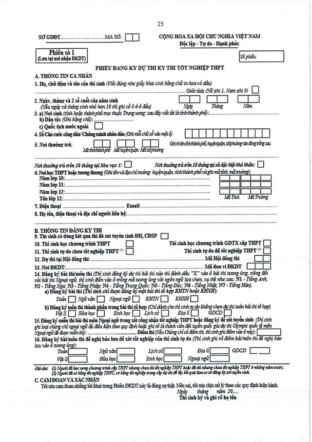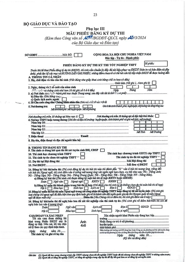 Mẫu phiếu đăng ký dự thi tốt nghiệp THPT 2024.