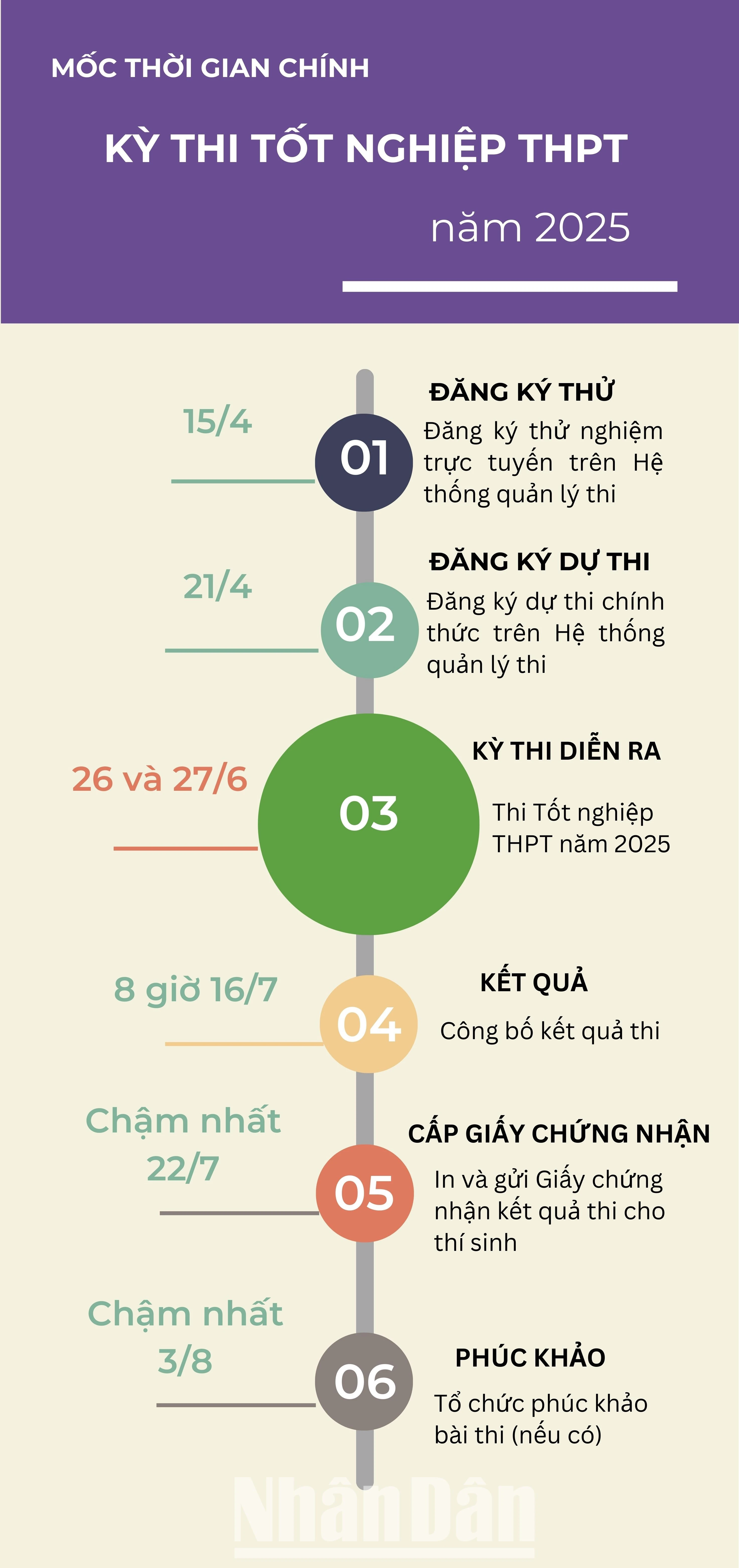 Kỳ thi tốt nghiệp THPT năm 2025 chính thức diễn ra vào ngày 26 và 27/6. Để chuẩn bị cho Kỳ thi, các thí sinh bắt đầu đăng ký tham dự theo hình thức trực tuyến trên Hệ thống quản lý thi của Bộ Giáo dục và Đào tạo từ ngày 21/4. Thí sinh cần nắm rõ các mốc thời gian Kỳ thi để có sự chuẩn bị tốt nhất.