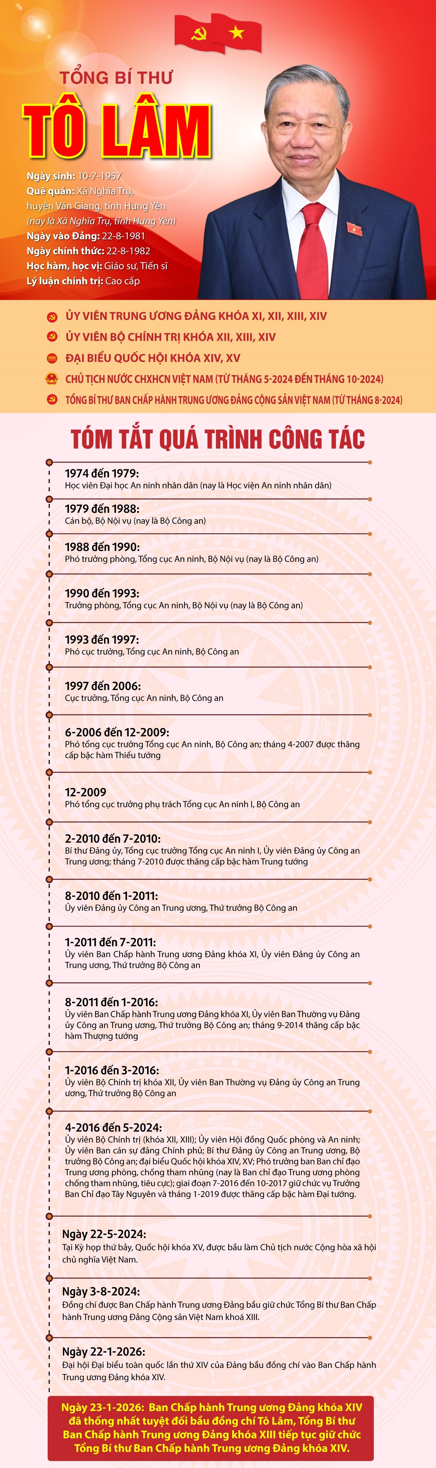 Ngày 23/1/2026, Ban Chấp hành Trung ương Đảng khóa XIV đã thống nhất tuyệt đối bầu đồng chí Tô Lâm, Tổng Bí thư Ban Chấp hành Trung ương Đảng khóa XIII tiếp tục giữ chức Tổng Bí thư Ban Chấp hành Trung ương Đảng khóa XIV.