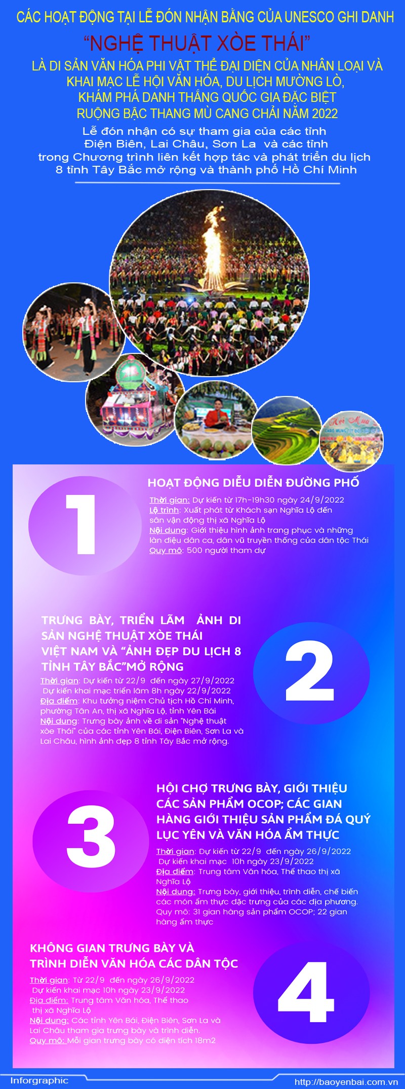 [Inforgraphic] Các hoạt động chính tại Lễ vinh danh “Nghệ thuật xòe Thái” và khai mạc Lễ hội văn hóa, du lịch Mường Lò, khám phá Danh thắng quốc gia đặc biệt Ruộng bậc thang Mù Cang Chải năm 2022