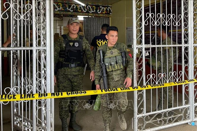Binh sĩ Philippines gác tại hiện trường vụ nổ ở cơ sở giáo dục thể chất và thể thao của Đại học bang Mindanao, thành phố Marawi, Philippines, ngày 3/12/2023.
