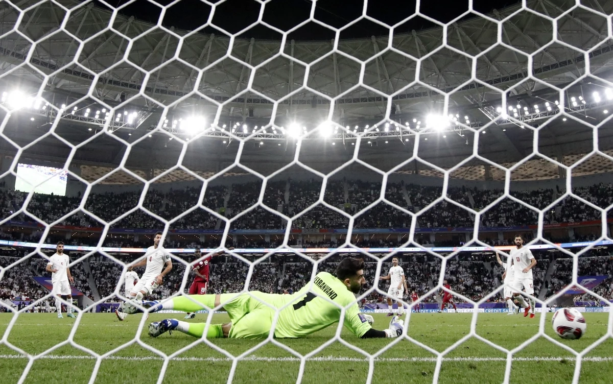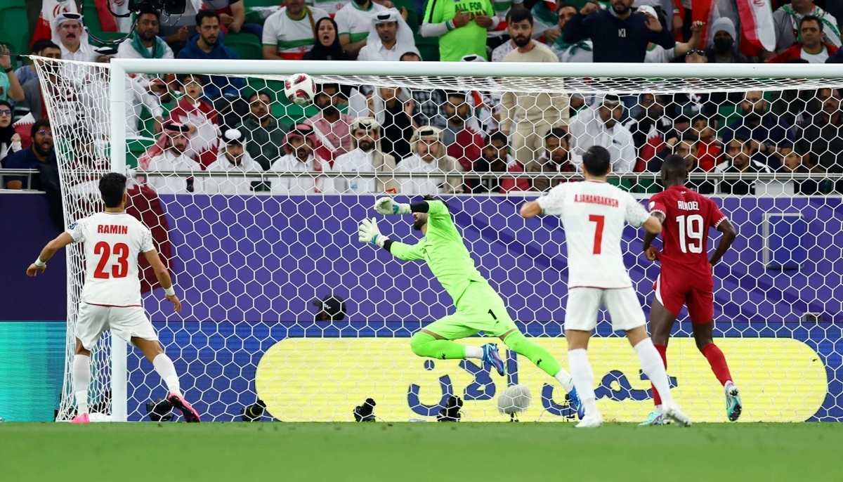 Thủ môn Iran bó tay trước cú sút đổi hướng thành bàn gỡ hoà 1-1 bên phía Qatar.