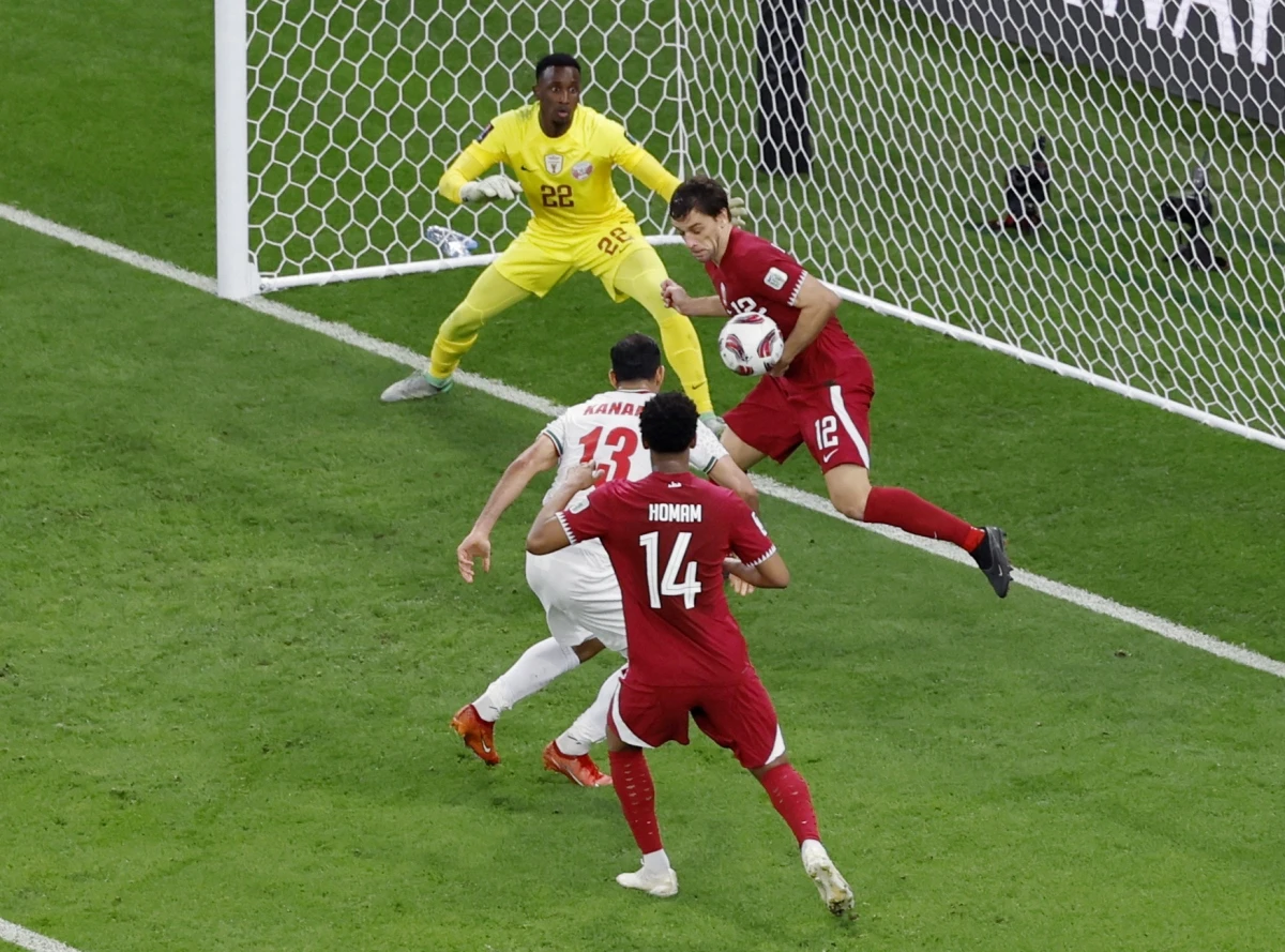 Các cầu thủ Iran sững người nhìn Almoez Ali ghi bàn vì tưởng đối phương đã việt vị.