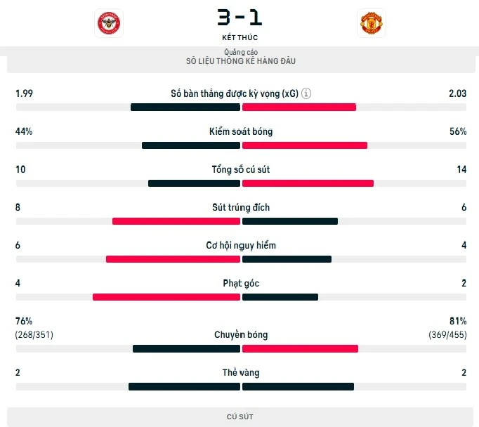 Đánh bại MU, các cầu thủ Brentford đã có chiến thắng thứ hai từ đầu mùa giải và vươn lên thứ 11 trên BXH, đứng ngay trên MU với cùng điểm số.
