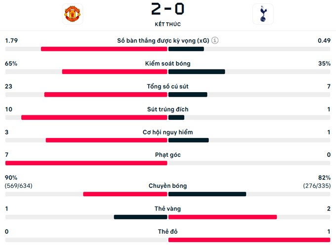 Dẫu vậy, những nỗ lực không biết mệt mỏi của MU cuối cùng cũng được đền đáp ở phút 81, khi Dalot lật vào từ cánh phải để Fernandes ra chân lạnh lùng nâng tỷ số lên 2-0. Đây cũng là kết quả cuối cùng của trận đấu.