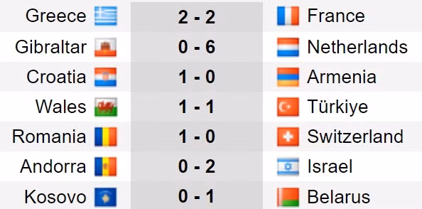 Tại các trận đấu còn lại, Romania thắng Thụy Sĩ 1-0, Andorra thua Israel 0-2 còn Belarus thắng Kosovo 1-0.