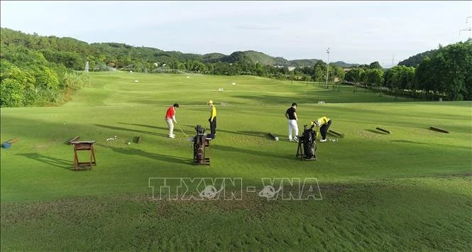 Du khách chơi golf kết hợp tham quan trải nghiệm tại sân golf Tràng An, huyện Nho Quan, tỉnh Ninh Bình.