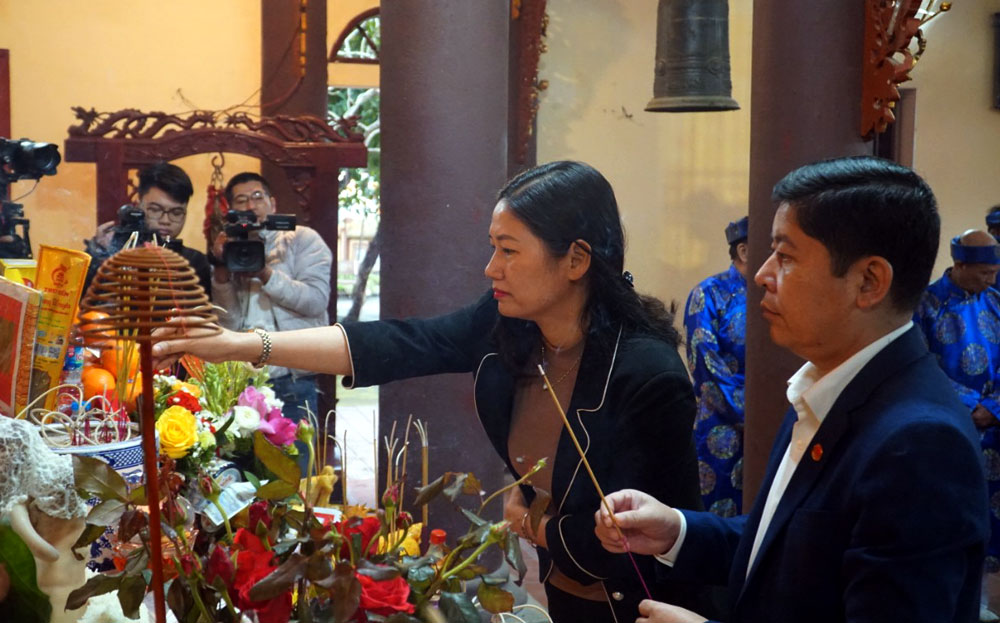 Các đồng chí lãnh đạo Ban Tuyên giáo Tỉnh ủy và thành phố Yên Bái dâng hương tại Đền Mẫu Nam Cường.