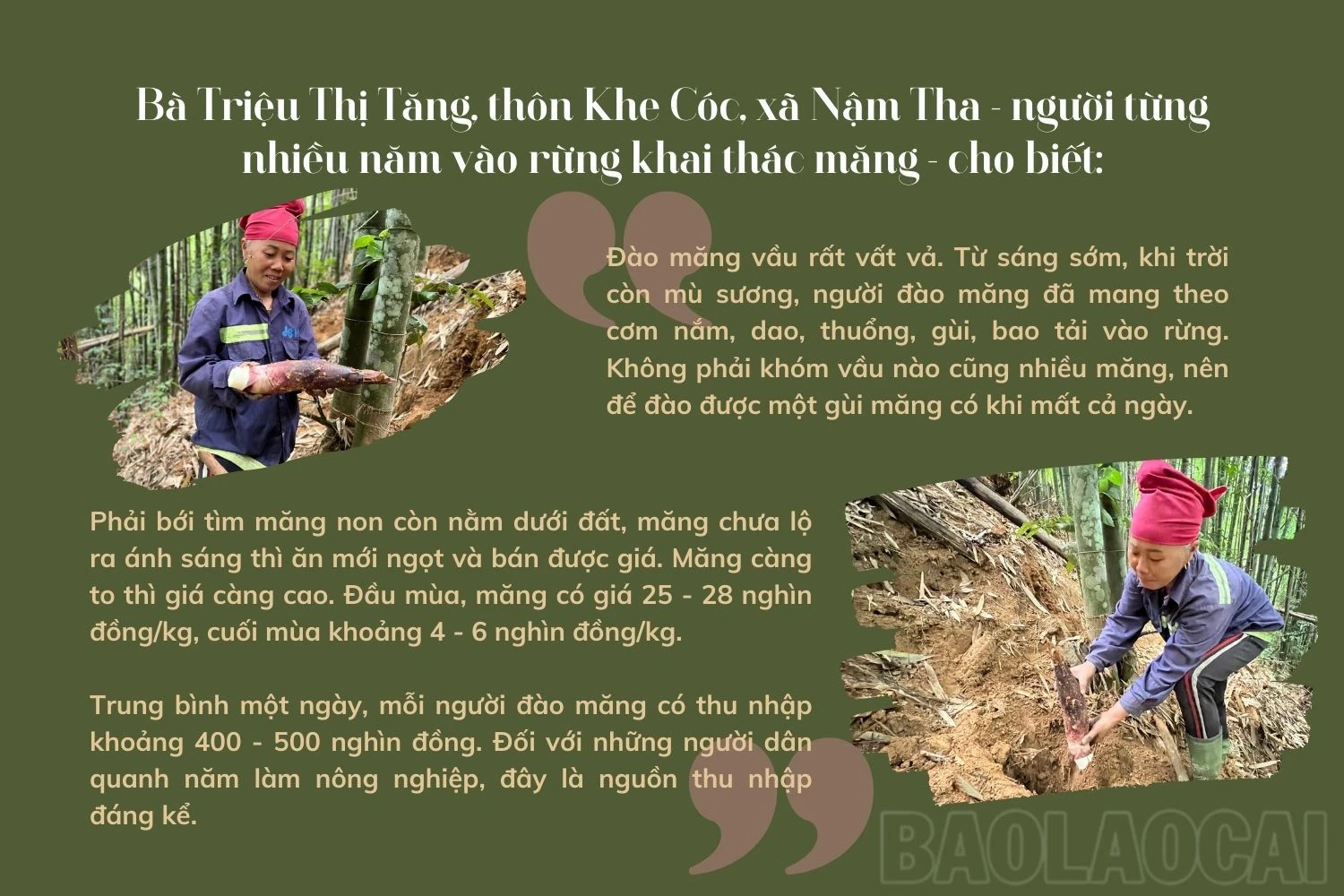 Ông Triệu Tòn Siết, Phó Chủ tịch UBND xã Nậm Tha cho biết: Trên địa bàn xã có hơn 11 nghìn ha rừng tự nhiên, trong đó diện tích rừng có phân bố cây vầu chiếm 2/3. Những năm gần đây, măng vầu có giá trị hàng hóa cao, nhiều hộ trong xã có thu nhập hàng chục triệu đồng từ khai thác măng. Ước tính vụ măng vầu năm 2022 - 2023, các hộ ở xã Nậm Tha thu gần 4 tỷ đồng từ khai thác măng vầu tự nhiên.