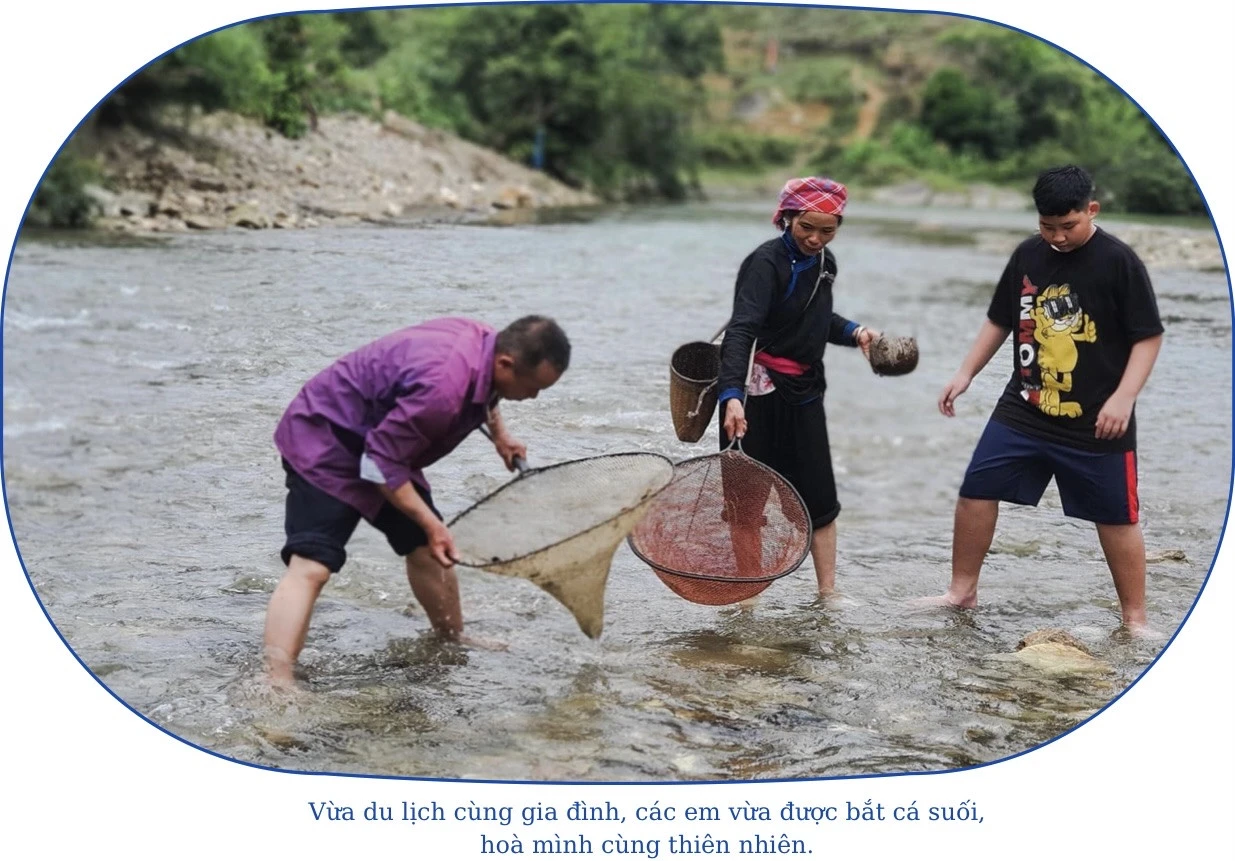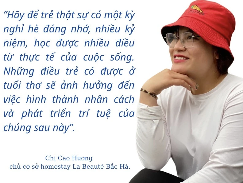 Khi đại dịch Covid-19 được kiểm soát, du lịch phục hồi, những người làm du lịch đưa ra nhiều sản phẩm du lịch mới, trong đó các tour du lịch dành cho trẻ được chú trọng, đặc biệt là trong các kỳ nghỉ hè. “Mùa hè, đừng nên ép con em mình đi học thêm nữa, cứ chữ nghĩa, con số thì chúng ta đánh mất tuổi thơ của con và có thể biến chúng thành những con vẹt, chỉ biết học. Rất nhiều đứa trẻ kiến thức “nhồi nhét” đầy đầu nhưng không biết phải xoay xở làm sao để có được bữa cơm khi mẹ vắng nhà. Hãy để trẻ thật sự có một kỳ nghỉ hè đáng nhớ, nhiều kỷ niệm, học được nhiều điều từ thực tế của cuộc sống. Những điều trẻ có được ở tuổi thơ sẽ ảnh hưởng đến việc hình thành nhân cách và phát triển trí tuệ của chúng sau này”, đó là chia sẻ của chị Cao Hương, chủ cơ sở homestay La Beauté Bắc Hà. Dịp hè này, chị Cao Hương tổ chức các tour du lịch kết hợp với học tập dành cho trẻ. Tham gia hoạt động du lịch do Cao Hương tổ chức, các em được khám phá bản làng ở Bắc Hà bằng xe máy, trải nghiệm gói bánh chưng đen, học vẽ sáp ong trên vải, làm nón lá cọ, bắt cá suối. Từ những hoạt động đó, các em khám phá thiên nhiên, có vốn kiến thức để vận dụng vào học tập, cuộc sống và tập cách sống tự lập; được tham quan cảnh đẹp, đồng thời các em sẽ xa rời điện thoại, thiết bị điện tử để sống hoà mình với thiên nhiên, ruộng đồng.