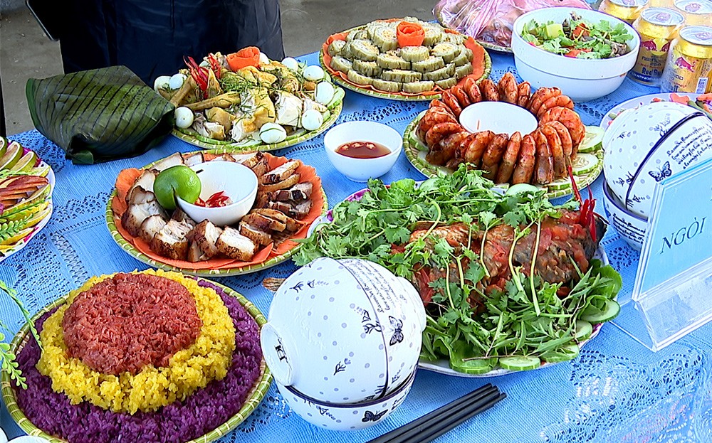 Mâm cơm của đồng bào người Tày vùng hồ Thác Bà.