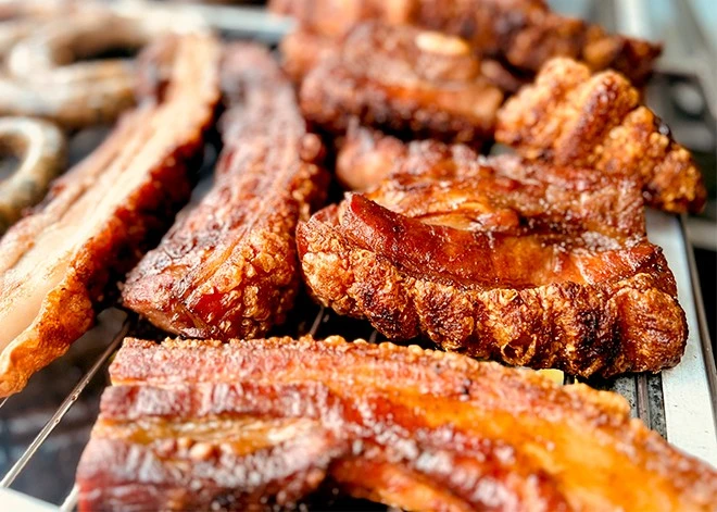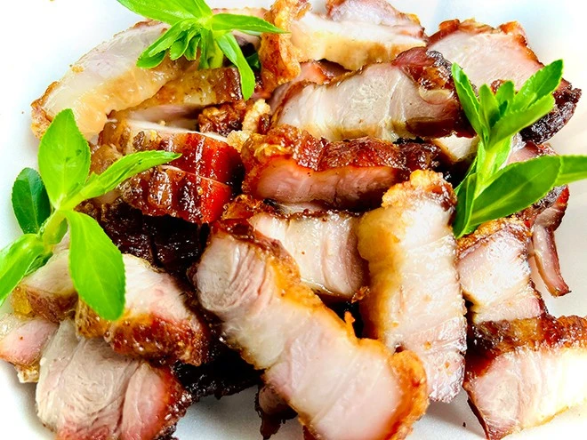 Ông chủ Đức có cách làm riêng để tạo nên món thịt thơm,= ngon thượng hạng. Món ba chỉ nổ bì ở đây, gia chủ kỳ công chọn để thịt có tỷ lệ nạc - mỡ cân bằng, phần bì sau khi quay có màu vàng nâu, bì giòn tan mà thịt bên trong vẫn rất mềm, ngọt.