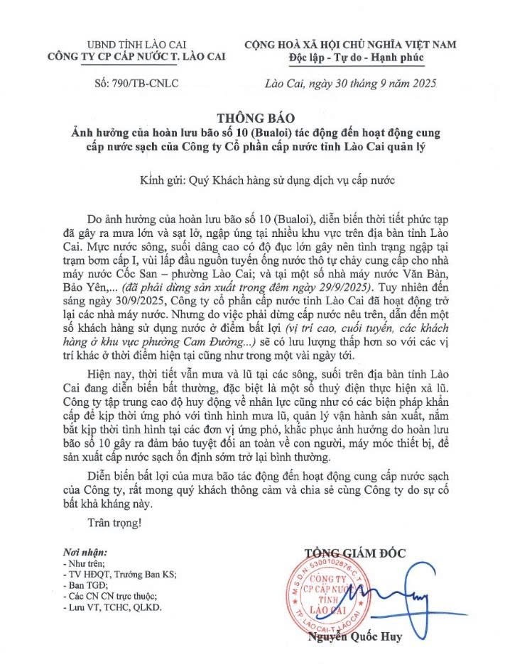 Theo thông tin từ Công ty Cổ phần cấp nước Lào Cai, đến sáng 30/9, đơn vị đã cơ bản khôi phục việc cấp nước sạch sinh hoạt cho các địa phương thuộc khu vực phía Bắc của tỉnh.