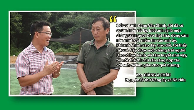 Nở nụ cười hiền hậu và bằng chất giọng lơ lớ nói tiếng Kinh không rõ, ông Châu kể lại: "Đối với anh Chính, tôi đã có sự tìm hiểu rất kỹ, biết anh ấy là một chàng trai người Dao thật thà, dũng cảm nên mình đặt niềm tin vào anh ấy. Khi anh Chính vào đây trao đổi, tôi thấy rất vui. Gặp được một chàng trai người Dao có học hành và tâm huyết như vậy, tôi nói "thế thì chú sẵn sàng hợp tác với anh để làm giàu cho quê hương”.