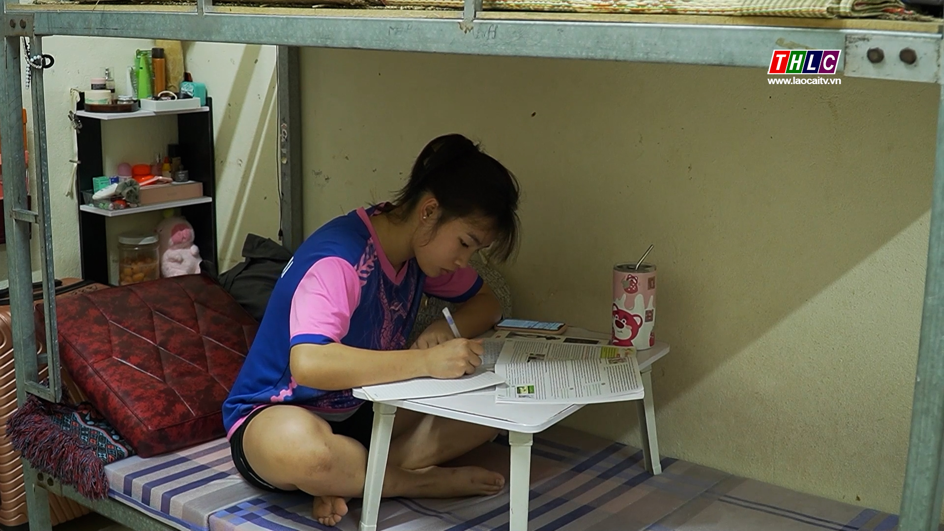 VĐV Hoàng Thị Minh Nguyện tranh thủ học vào buổi tối muộn.