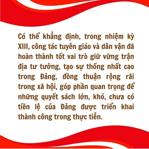 Có thể khẳng định, trong nhiệm kỳ XIII, công tác tuyên giáo và dân vận đã hoàn thành tốt vai trò giữ vững trận địa tư tưởng, tạo sự thống nhất cao trong Đảng, đồng thuận rộng rãi trong xã hội, góp phần quan trọng để những quyết sách lớn, khó, chưa có tiền lệ của Đảng được triển khai thành công trong thực tiễn.