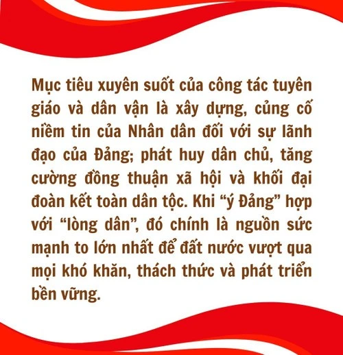 Mục tiêu xuyên suốt của công tác tuyên giáo và dân vận là xây dựng, củng cố niềm tin của Nhân dân đối với sự lãnh đạo của Đảng; phát huy dân chủ, tăng cường đồng thuận xã hội và khối đại đoàn kết toàn dân tộc. Khi “ý Đảng” hợp với “lòng dân”, đó chính là nguồn sức mạnh to lớn nhất để đất nước vượt qua mọi khó khăn, thách thức và phát triển bền vững.