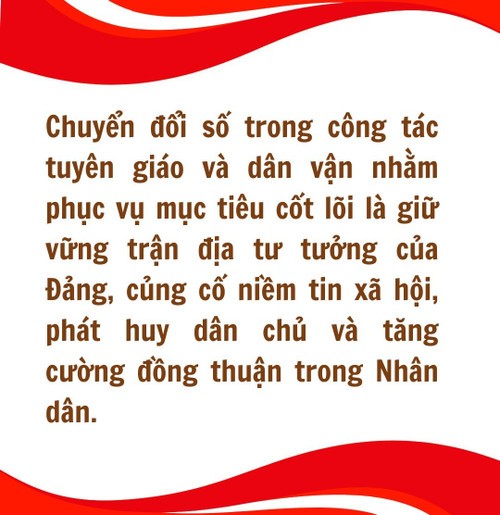 Thực hiện chỉ đạo của Tổng Bí thư Tô Lâm, Ban Tuyên giáo và Dân vận Trung ương đang từng bước xây dựng và vận hành hệ sinh thái số trong toàn ngành; gắn chuyển đổi số với yêu cầu nắm chắc và làm chủ khoa học-công nghệ, đồng thời nâng cao năng lực quản lý thông tin, định hướng dư luận xã hội. Mục tiêu là làm cho đội ngũ cán bộ tuyên giáo, dân vận các cấp hiểu rõ yêu cầu nhiệm vụ, chủ động triển khai hiệu quả các kế hoạch công tác; đồng thời góp phần hạn chế thông tin xấu độc, thông tin giả, giữ vững niềm tin của Nhân dân.