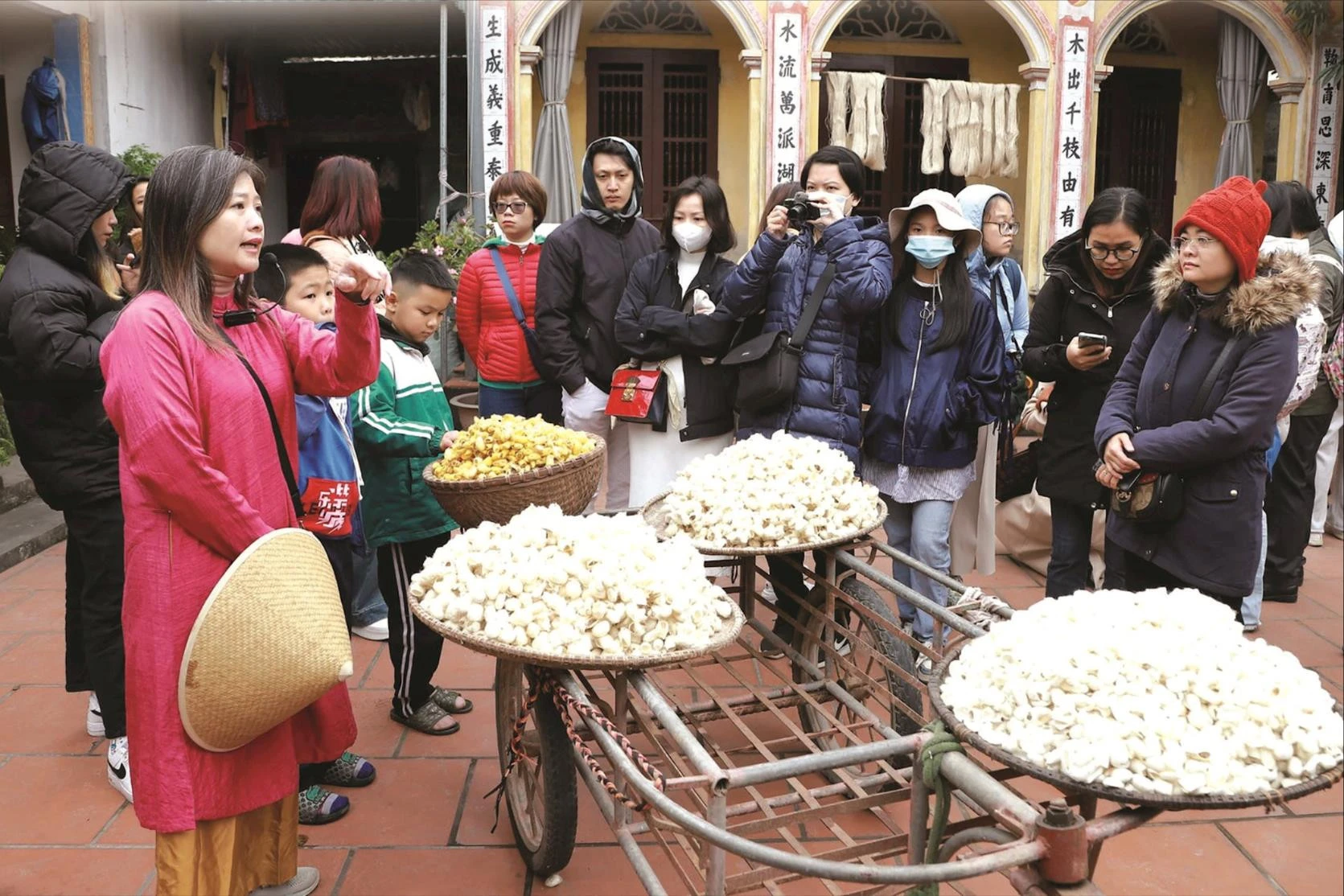 Du khách trải nghiệm tại làng dệt đũi Nam Cao (Thái Bình).