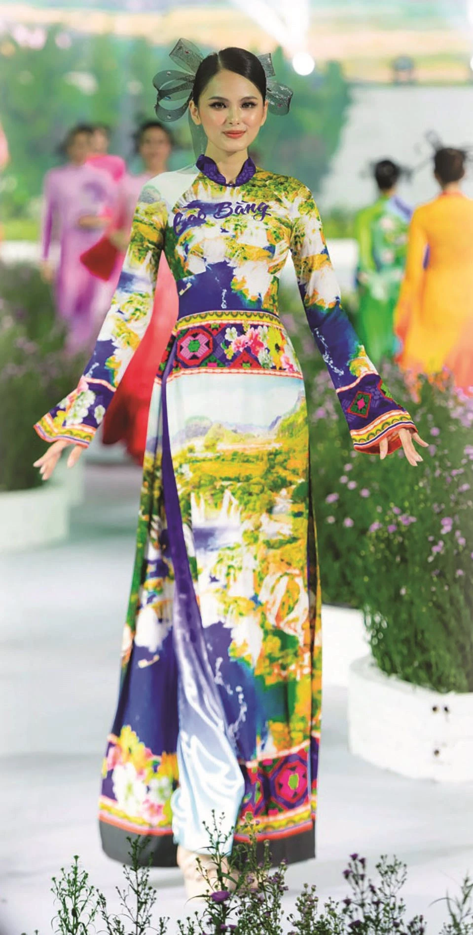 Mẫu áo dài có nhiều họa tiết văn hóa của nhà thiết kế Vũ Thảo Giang.
