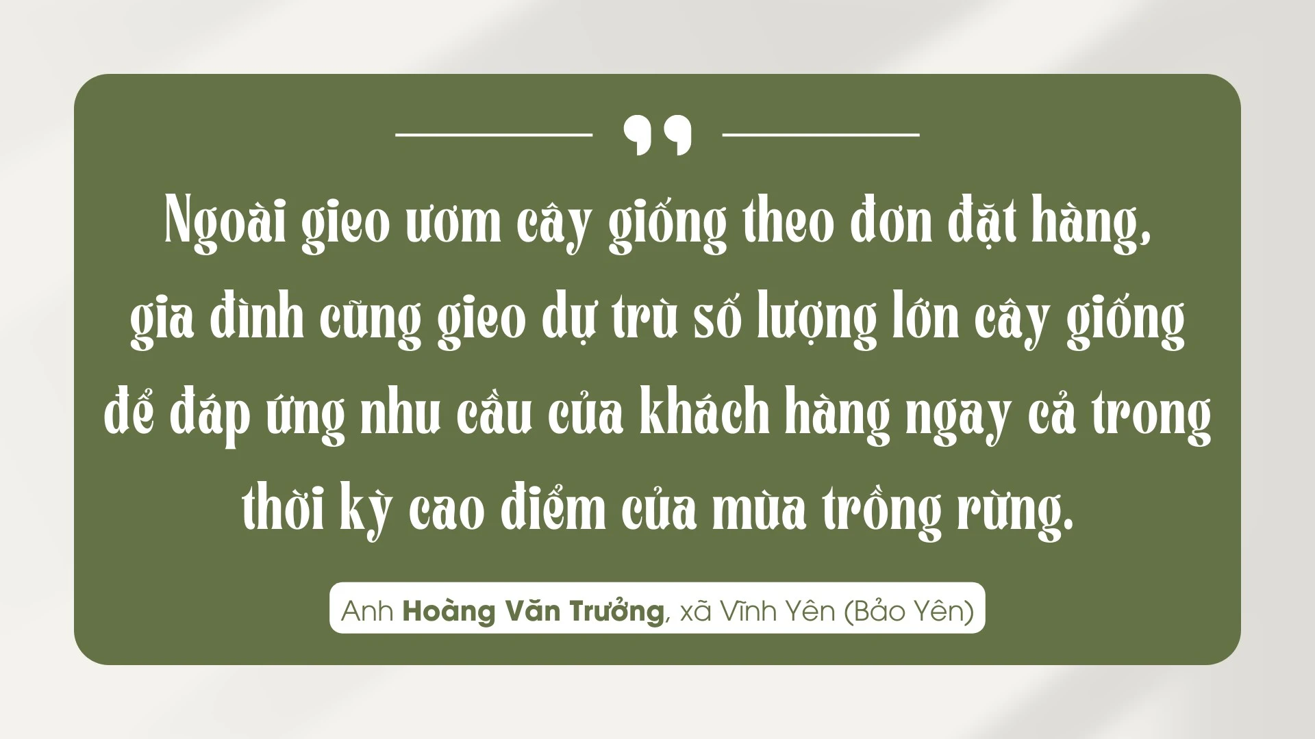 Gắn bó với nghề gieo ươm cây giống lâm nghiệp gần 20 năm, cơ sở sản xuất cây giống của bà Đặng Thị Thắm, xã Sơn Hải (Bảo Thắng) là địa chỉ tin cậy của nhiều hộ dân trong và ngoài huyện mỗi vụ trồng rừng. Được biết, mỗi năm cơ sở này gieo ươm và xuất ra thị trường khoảng 1 - 1,2 triệu cây giống các loại, như quế, thông mã vĩ, mỡ, xoan... Bám sát kế hoạch trồng rừng, cơ sở đã tính toán, gieo ươm, chăm sóc cây giống để đảm bảo xuất bán đúng khung thời vụ.
