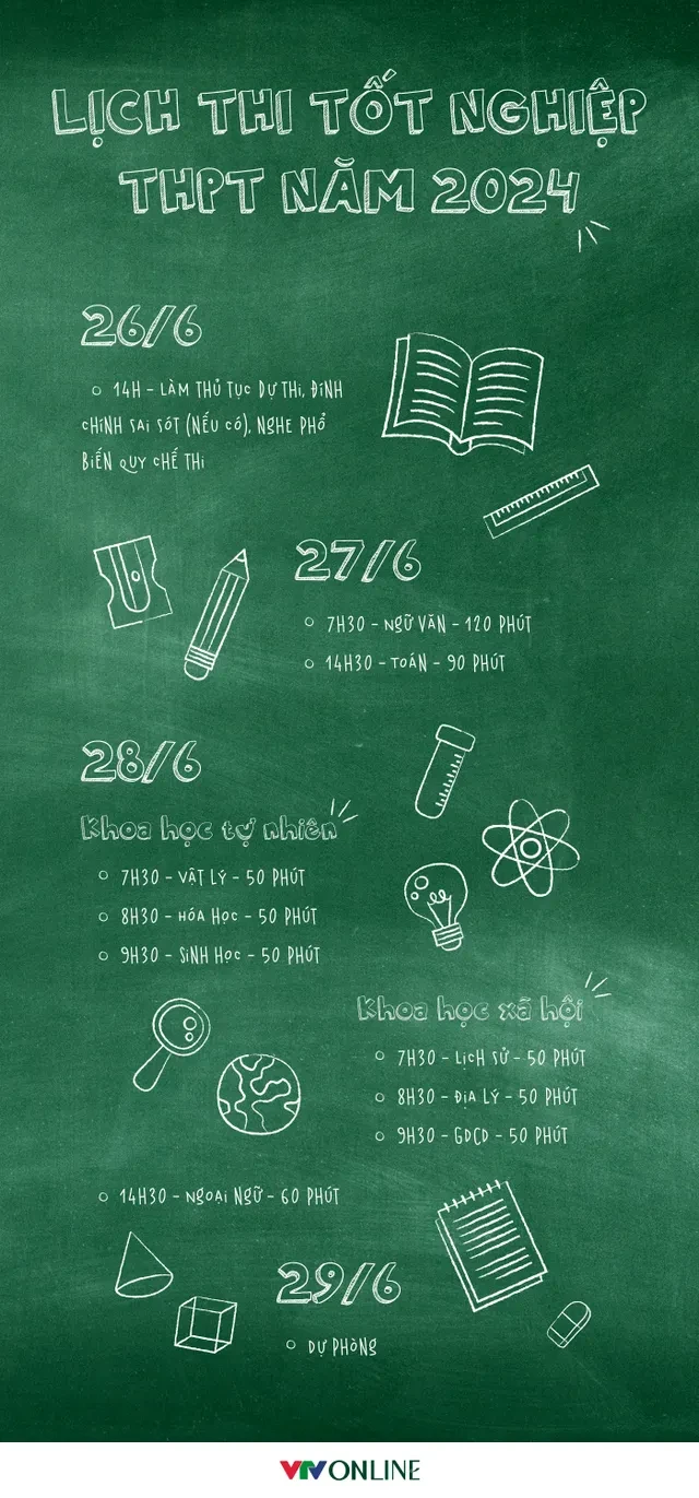 Trước đó, vào ngày 27 và 28/6, thí sinh sẽ tham dự kỳ thi tốt nghiệp trung học phổ thông. Kết quả thi tốt nghiệp trung học phổ thông năm 2024 sẽ được công bố vào 8h ngày 17/7.