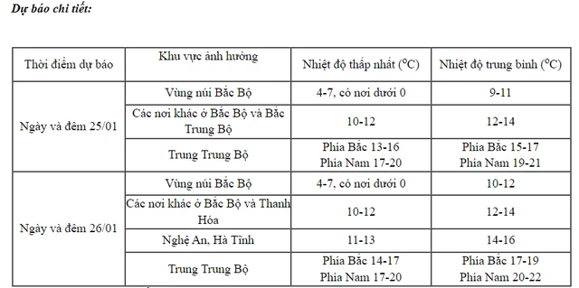Dự báo, trên đất liền, ngày và đêm 25/1, không khí lạnh cường độ mạnh tiếp tục ảnh hưởng đến khu vực Bắc Bộ và Trung Bộ. Gió Đông Bắc trong đất liền mạnh cấp 3, vùng ven biển cấp 4 - 5, giật cấp 7 - 8. Khu vực Bắc Bộ và Bắc Trung Bộ trời rét hại, khu vực Trung Trung Bộ trời rét, có nơi rét đậm.