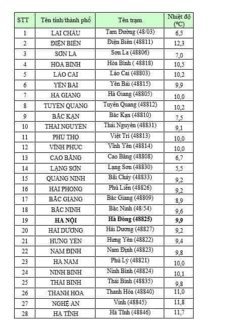 Thủ đô Hà Nội nhiều mây, không mưa. Gió Đông Bắc cấp 3, trời rét hại. Nhiệt độ thấp nhất 10 - 12 độ C. Nhiệt độ cao nhất 12 - 14 độ C.